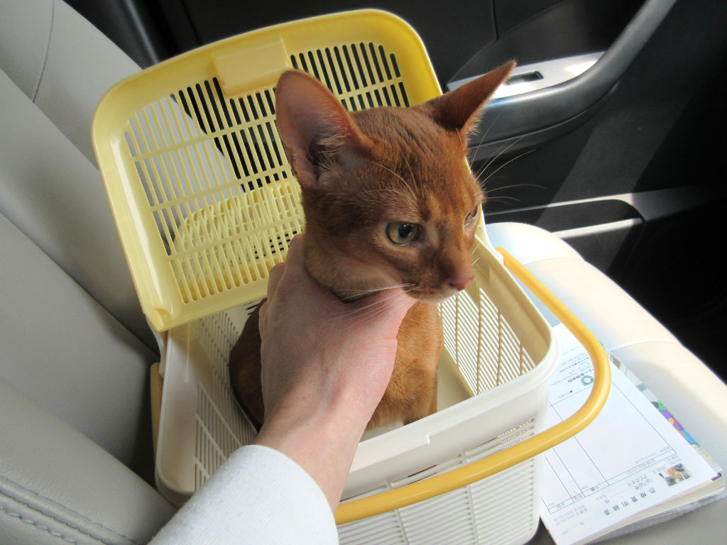 そして帰りの車中のアビのすけ…、信号待ちの時に、少しだけアビのすけを籠から出してあげようとしているのですが、籠から脱出してしまったら大変なので、アビのすけを押さえて写真を1枚…。