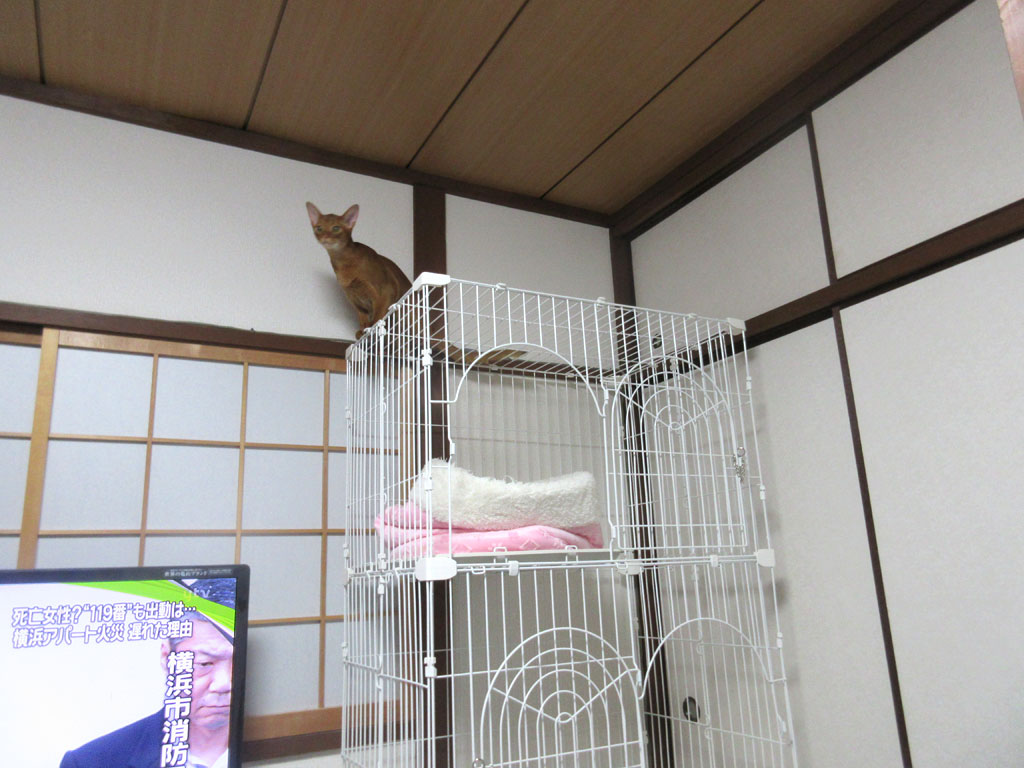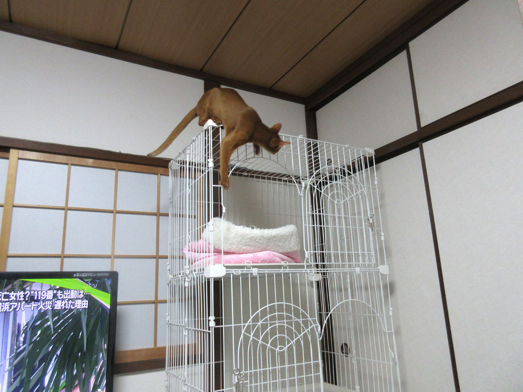 これは4日前の晩の事、アビのすけは相変わらず、部屋の中を走り回って、ケージを網伝いに天井に登ろうとしてたんです…、本当に元気で疲れ知らずな、アビシニアンの男の子なんです。