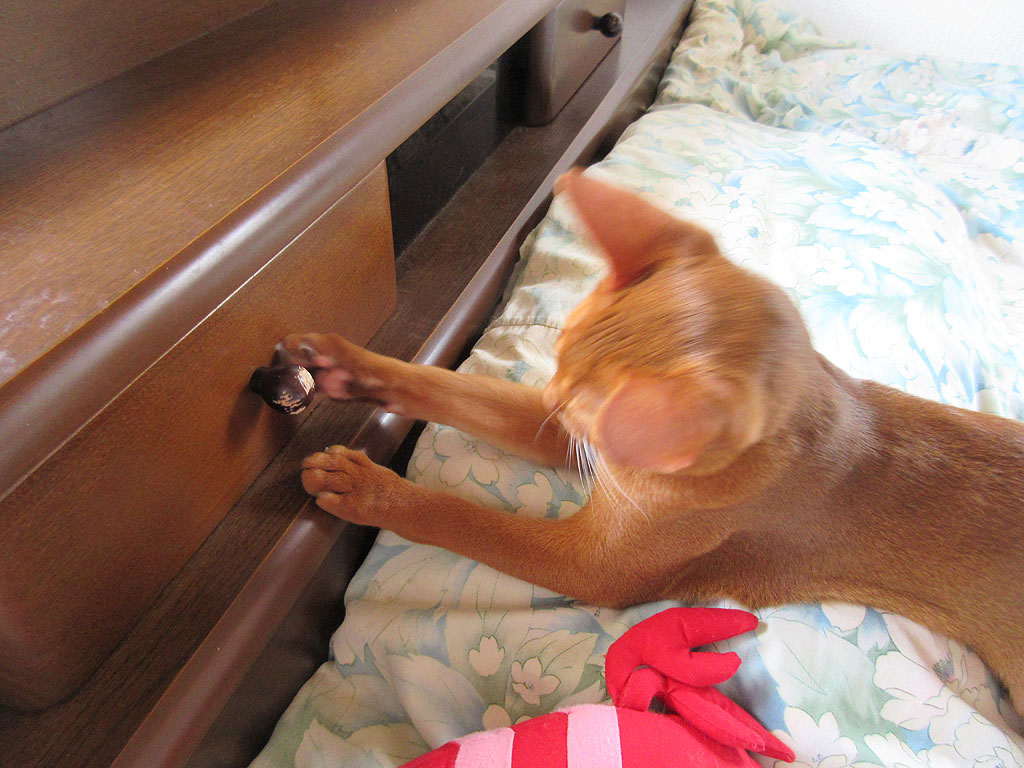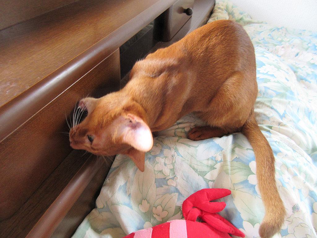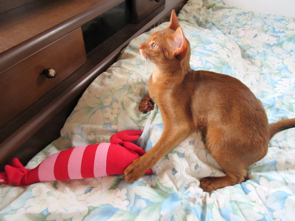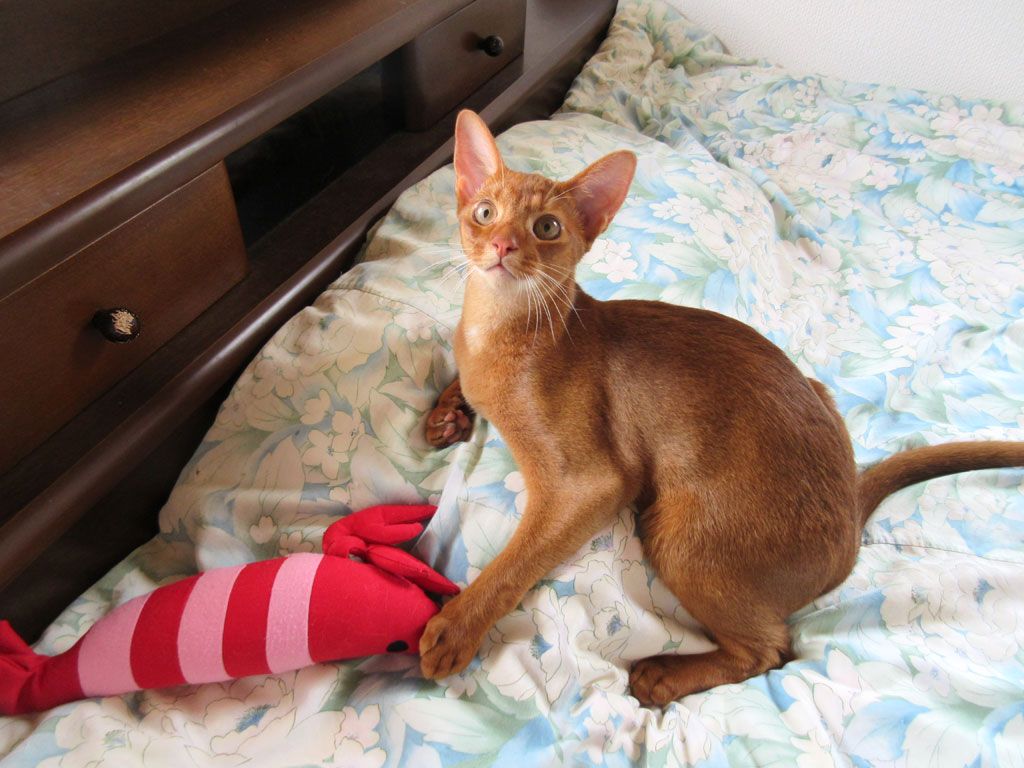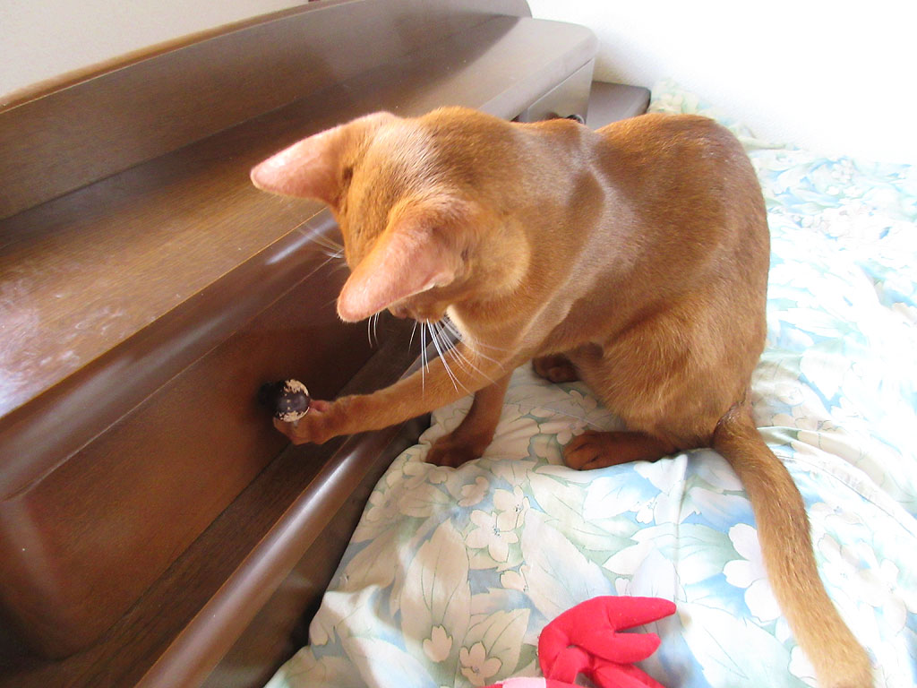 一人ででも悪戯をしている、アビシニアンのアビのすけ。