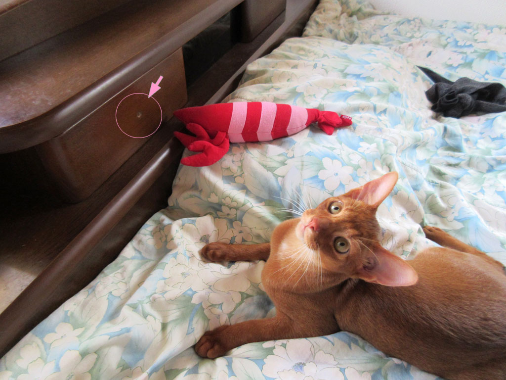 この写真は、4日前の(日)のアビのすけの様子ですが、また、ベットの頭の所の物入れの取っ手を、まさにかじったろかって感じで、悪戯っぽい顔をしている所です。