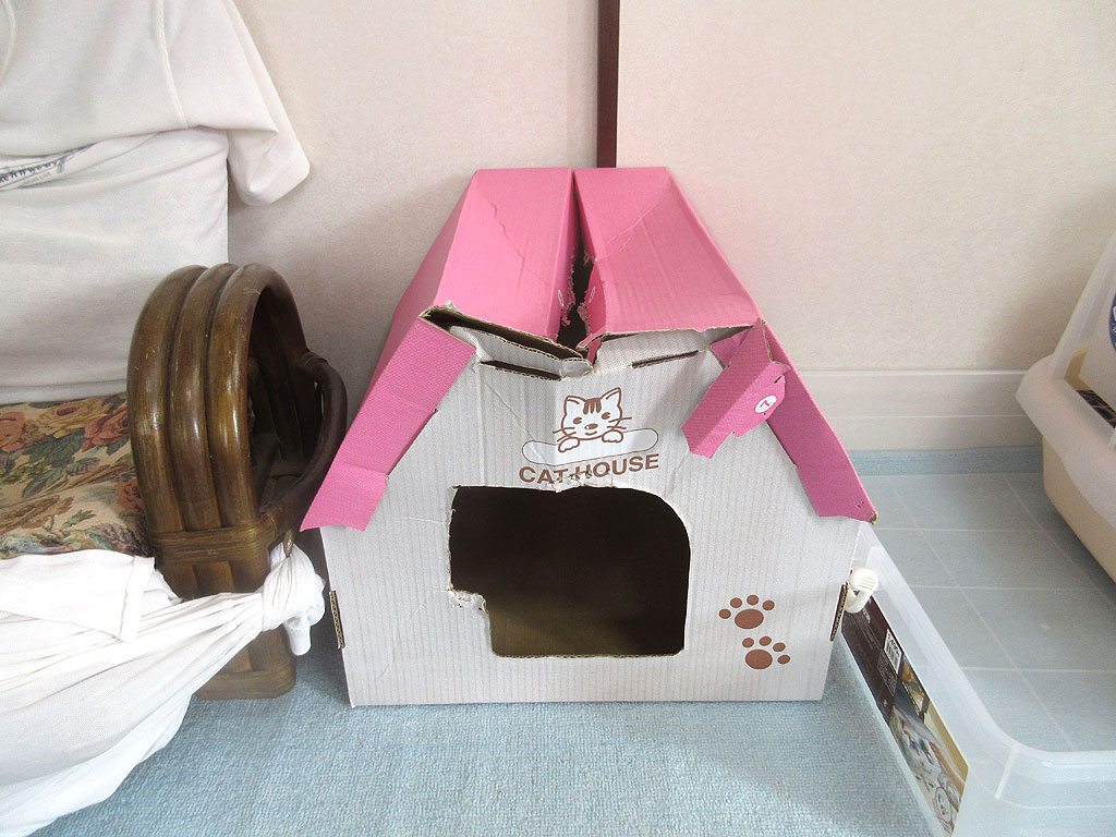 そして、話はガラッと変わりますが、これ、猫たちがお気に入りのダンボールハウスなのですが、最近、アビのすけがこのダンボールハウスで悪戯三昧なのです。
