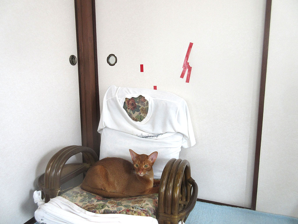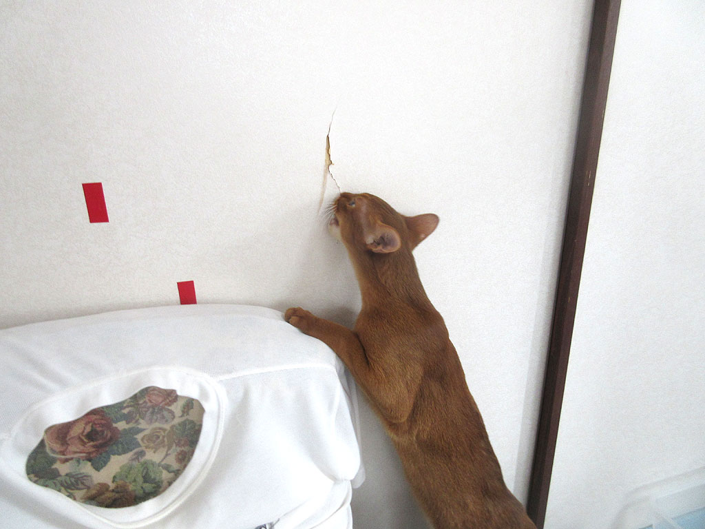 ちなみに、左側の赤のビニールテープで補修をしている所は、約2年前、ロシ子が子猫の時に開けた穴を塞いだもの…、今ではすっかり、ロシアンブルーの上品なレディーに育ってくれたロシ子ちゃんでも、子猫の時には襖に穴を開ける程のやんちゃ娘だったので、やんちゃ坊主のアビのすけが穴を開けるのも、考えてみれば当然の事。