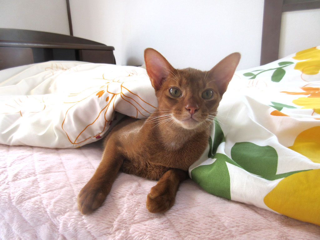 そして、私が猫たちのお世話をする為に2階に上がったら、ひょっこりと布団から顔を出して来たアビのすけ…、アビシニアンってほんとお茶目…!