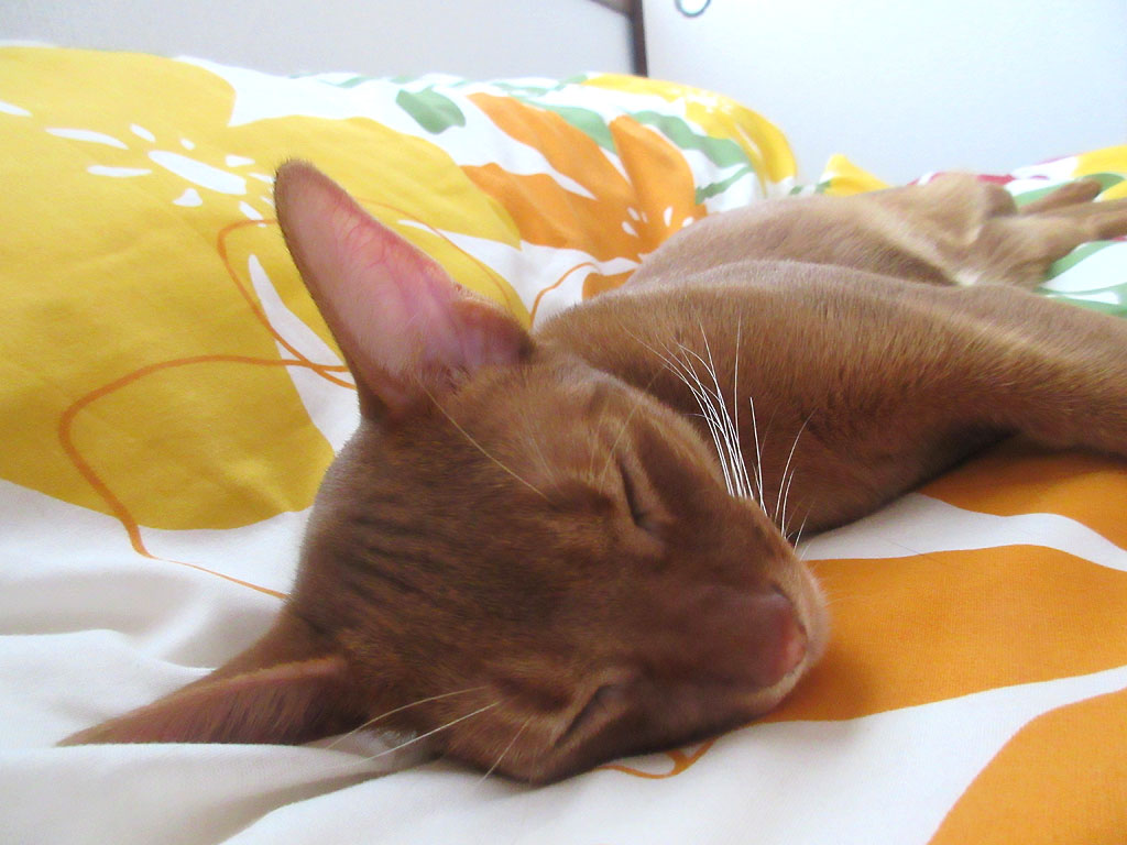 夕方、昼寝中のアビシニアン。これは、今日の夕方、ベットの上で昼寝をしていたアビのすけですが、肋骨や背骨は全然、触れるし、まだ大丈夫な様な気はするけど、一応、明日、アビのすけの顎ニキビの事もあるし、ロシ子の歯茎の出血の事もあるし、動物病院に猫たちを連れて行って来ようと思っています。