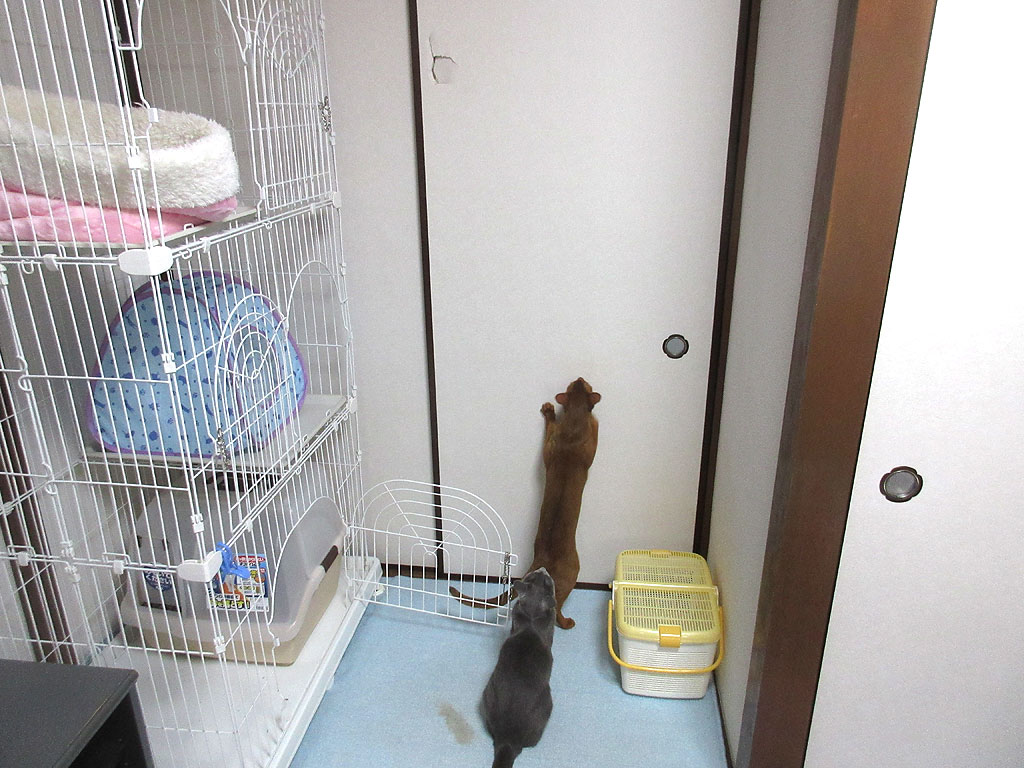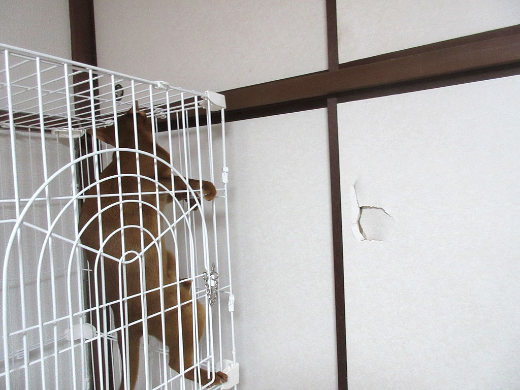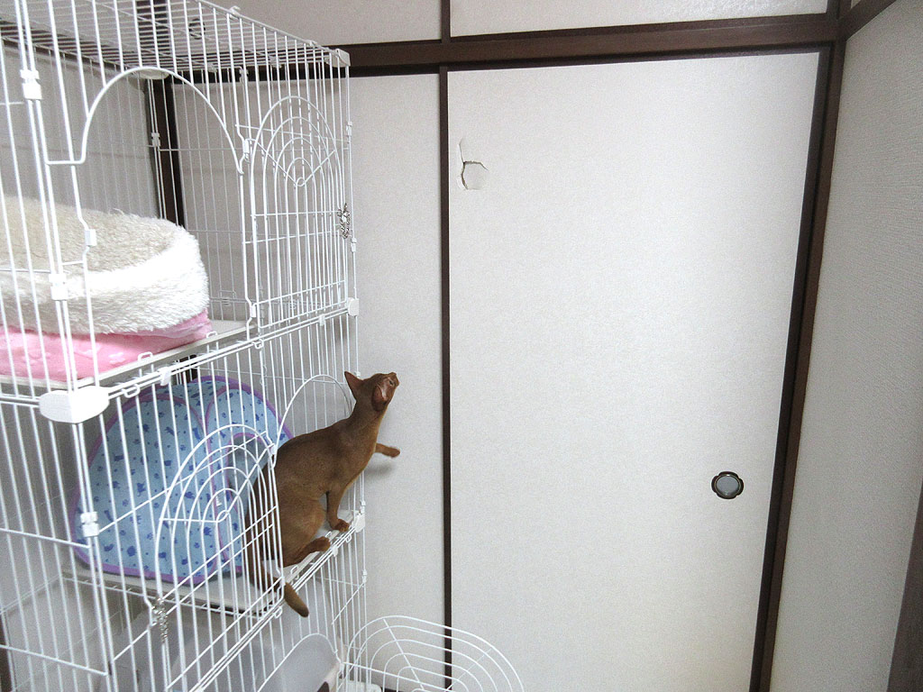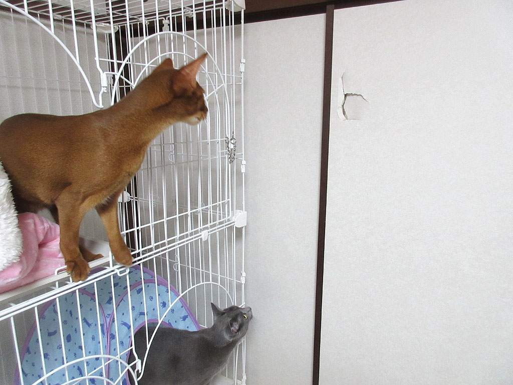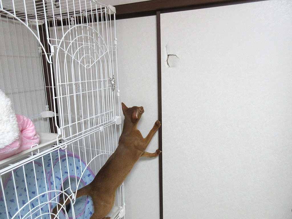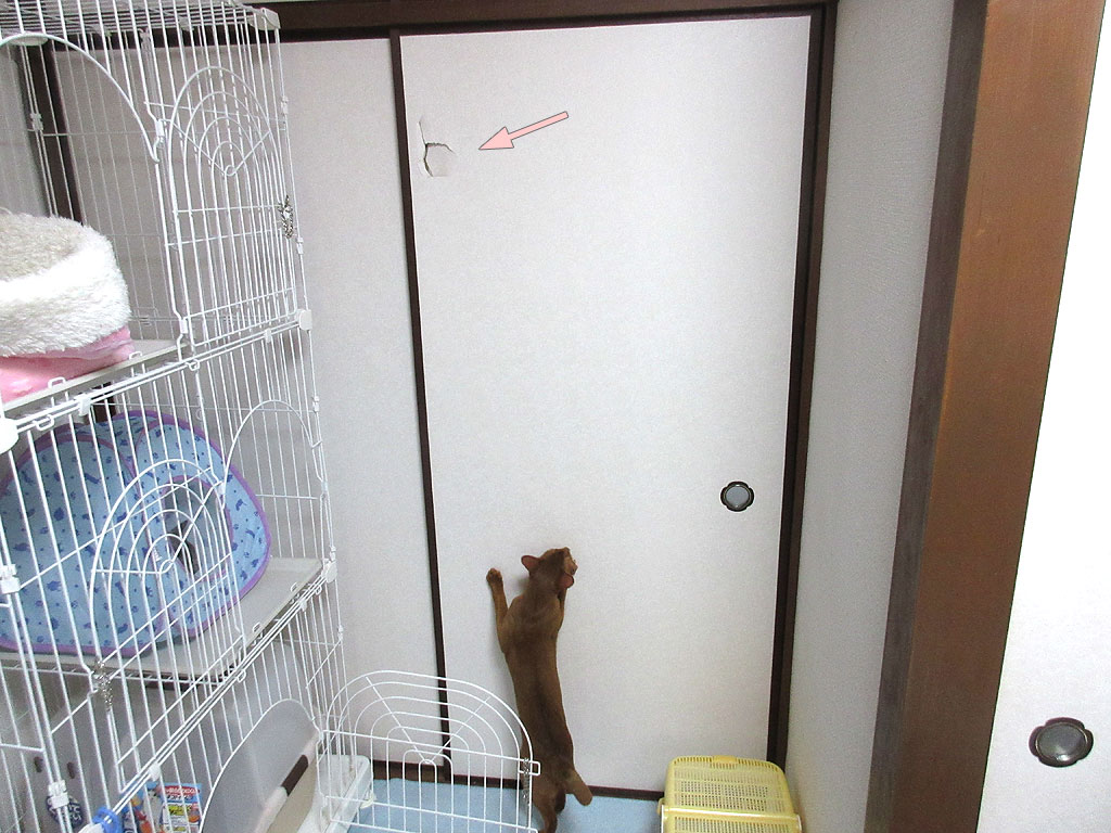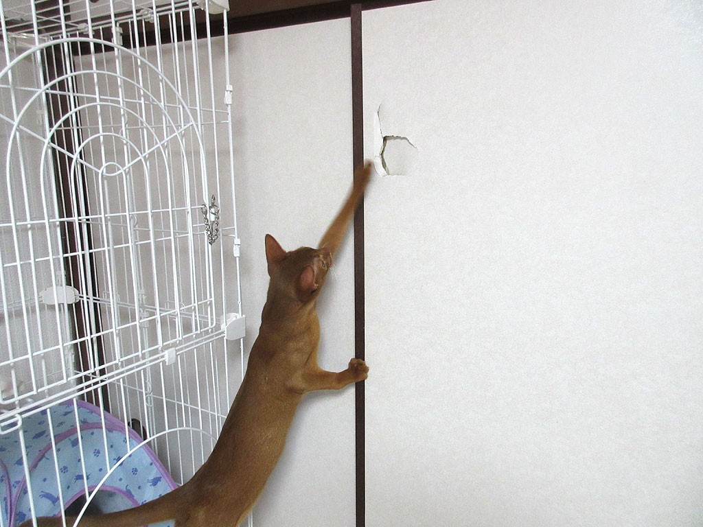 やんちゃ坊主のアビシニアン。何でこの襖のこの場所に穴が開いたかという事なのですが、ちょっと文章では表現がしにくいのですが、私がケージの前辺りでアビのすけを抱っこしていたのですが、アビのすけがくねってもがいて脱出をしようとした時に、私の抱っこから落ちそうになったアビのすけを、私が捕まえようとした時にお手玉をしてしまった恰好になって、アビのすけを捕まえ損ねて襖の方に放り投げてしまった状態になってしまったのです。