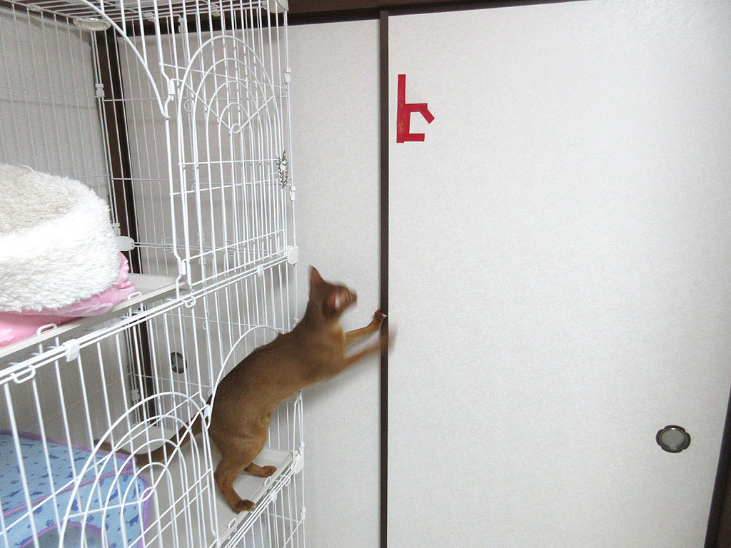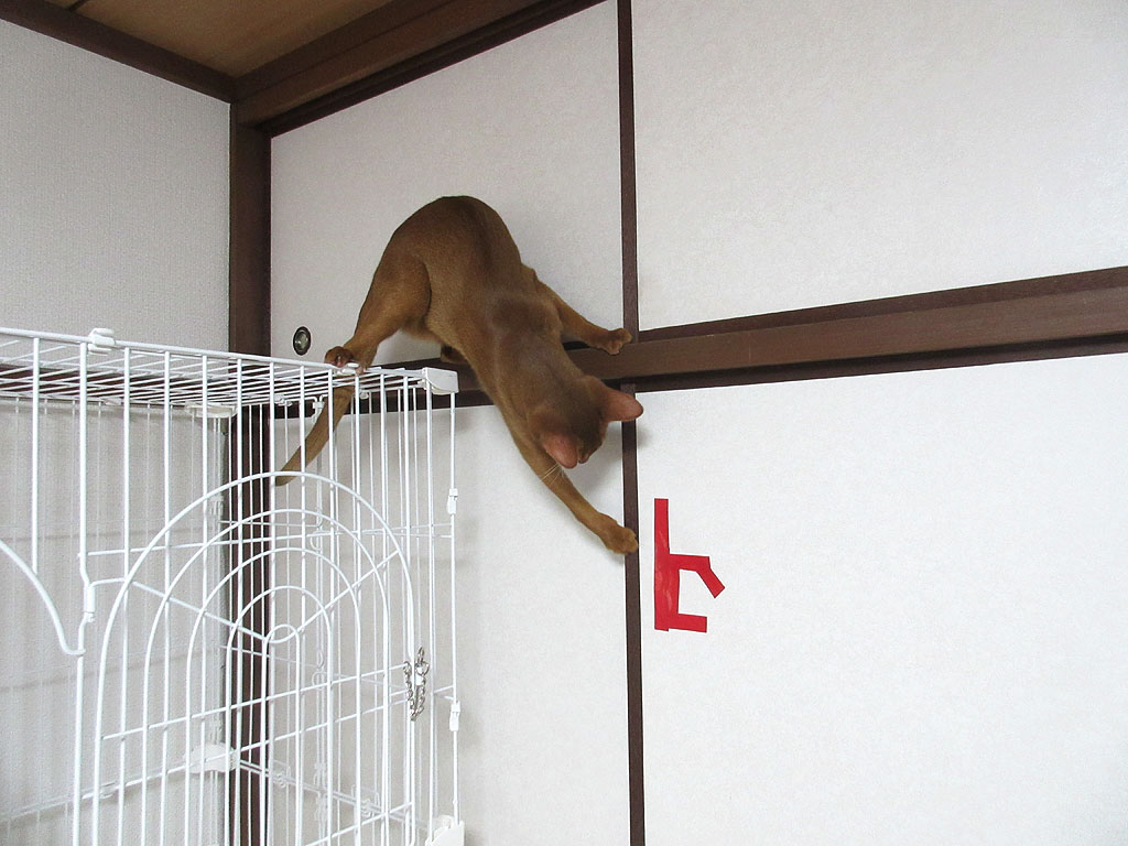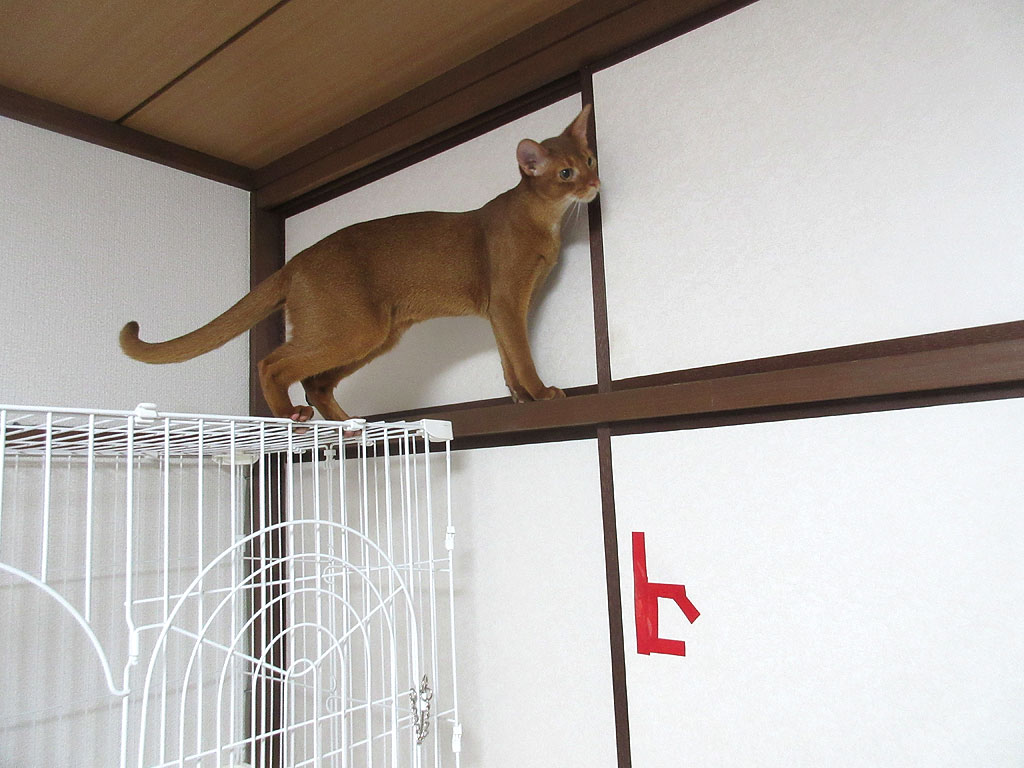 あきらめないアビシニアン。しかし、諦めの悪いアビのすけは、なかなか諦めません…、今度は、ケージの天井の上に上って触る気満々…、恐ろしや、この男…。(涙)