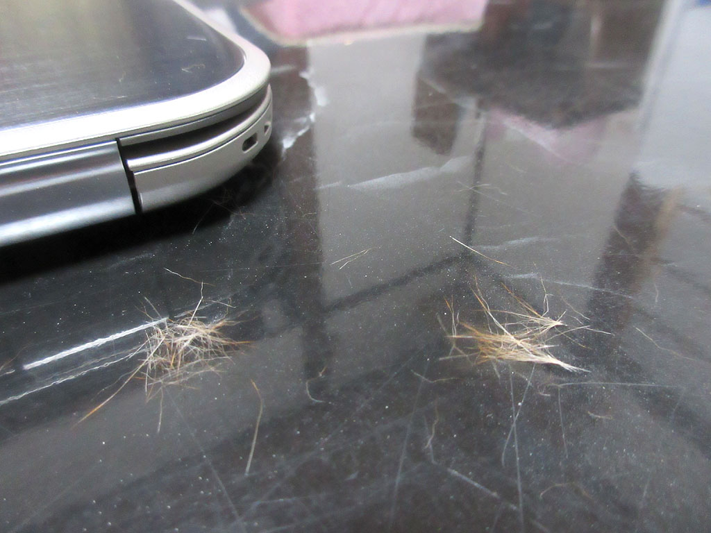この写真は、昨日の晩、猫たちに晩ご飯を出してあげた後の事、猫たちが美味しそうにご飯を食べているなぁーなんて思いながら、ローテーブルの上を見てみると、何やらアビのすけの毛が無造作に落ちていて…。