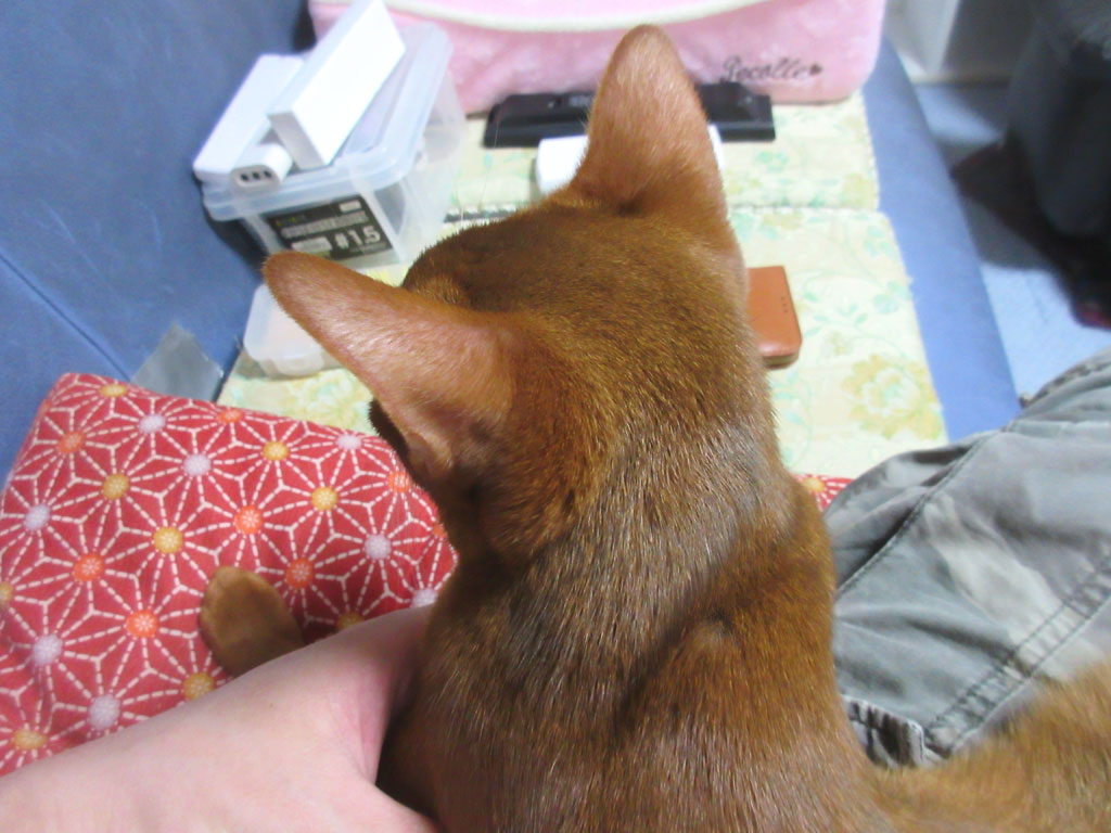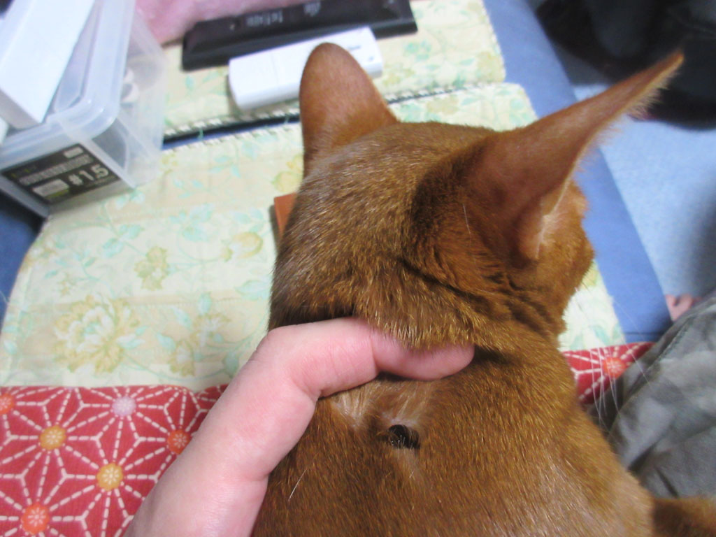 晩ご飯中のアビのすけは、もう晩ご飯しか見えていない状態なので、私が引き離しても大騒ぎをして暴れるので、晩ご飯を食べ終わった頃を見計らって、アビのすけを私の膝の上に連れて来て、全身のボディチェックを始めたのです…、んんん…、やばい…、ハゲがある…。