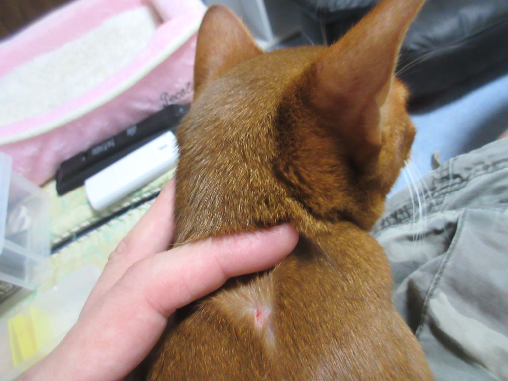 まぁ、それ程、ひどい傷ではなかったのですが、いずれにしても、毛が毟られて出血をしてるって尋常じゃないし、なんでこんな事が起こったのか、原因が分からないだけに気になってしまいます…。