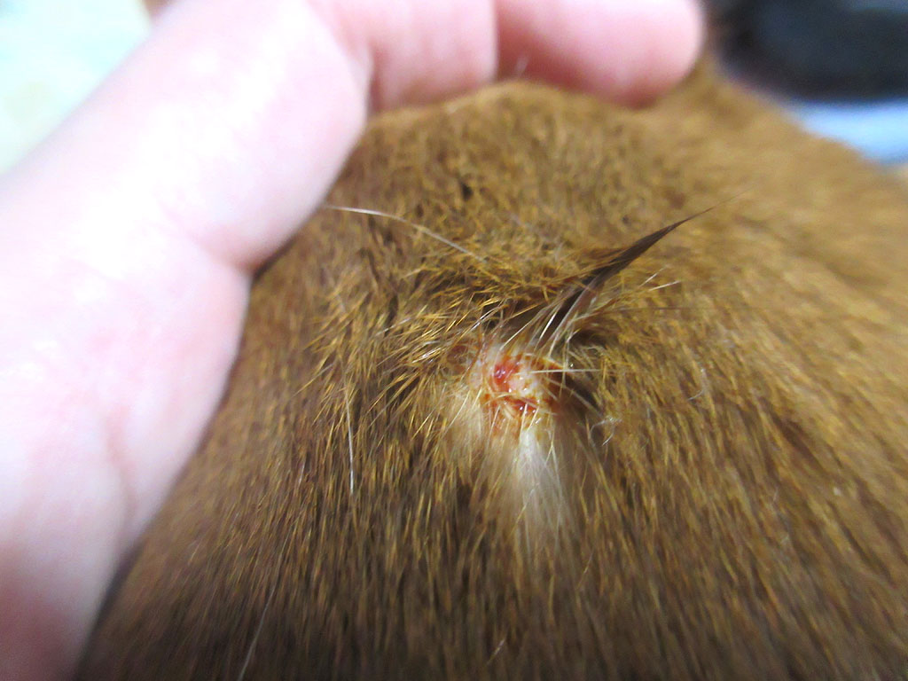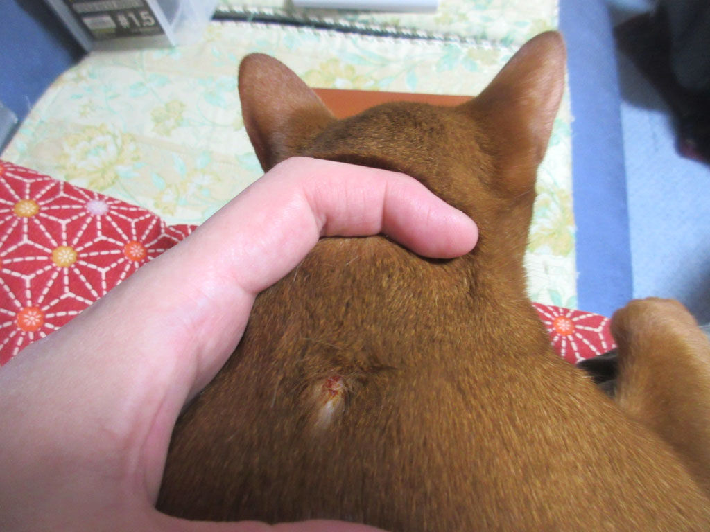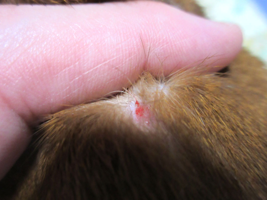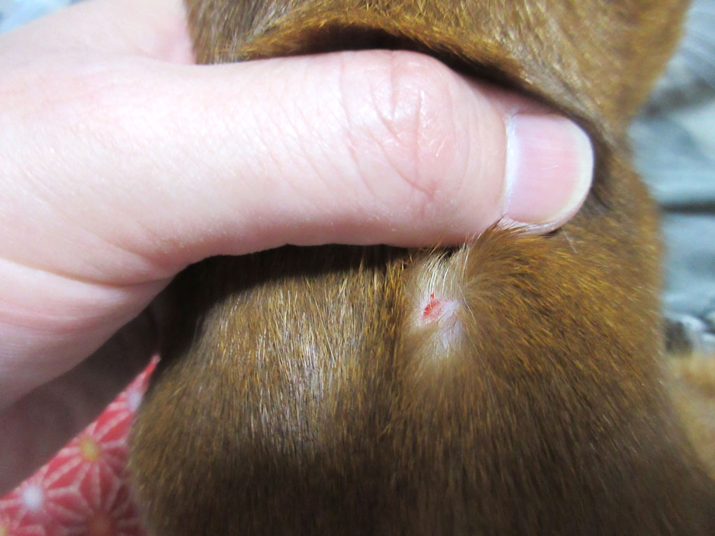 そして2つ目は、元々、かさぶたがあった所を、痒くて自分の後ろ足で掻き毟って、それでかさぶたが剥がれて出血してしまったパターン…。