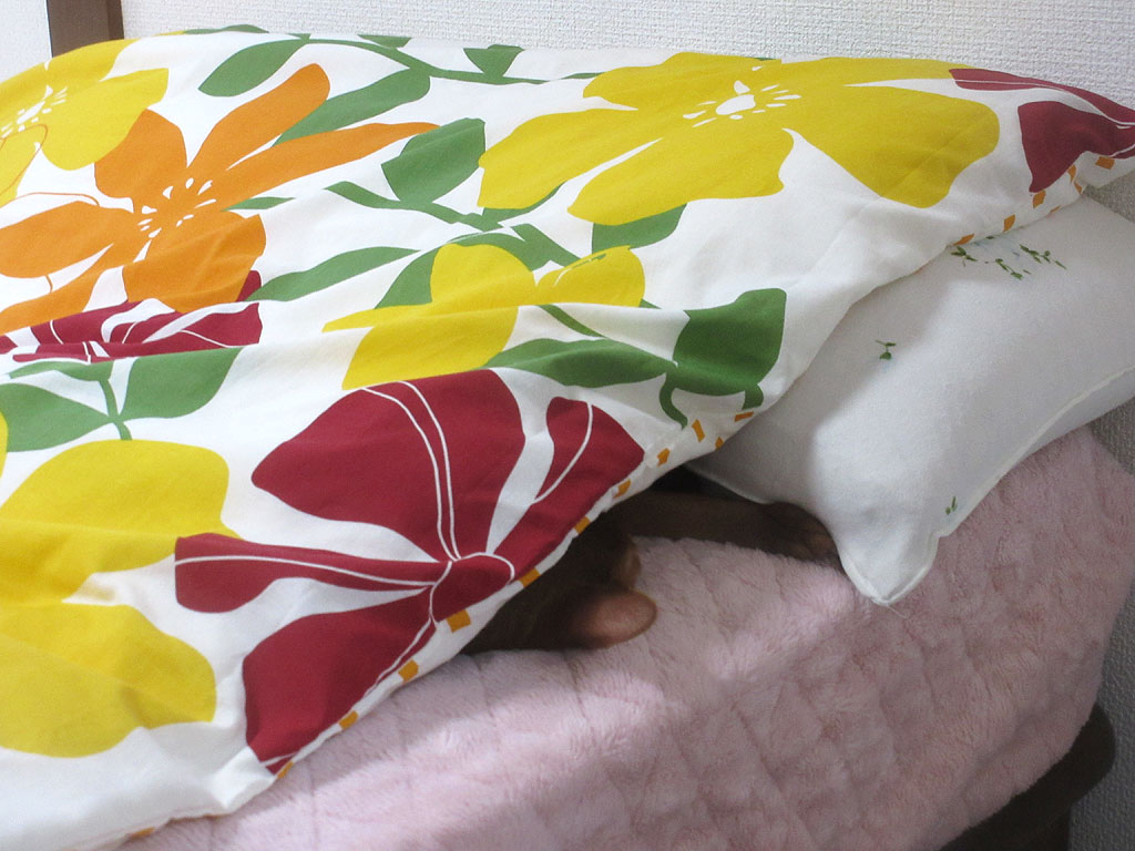 そして、今朝のアビのすけも、私が布団から出た後、この場所で同じ様に頭から布団をかぶって寝ていて、この所は、「ほぼ毎日」ではなくて、「毎日」のアビのすけのお決まりの行動になっています。