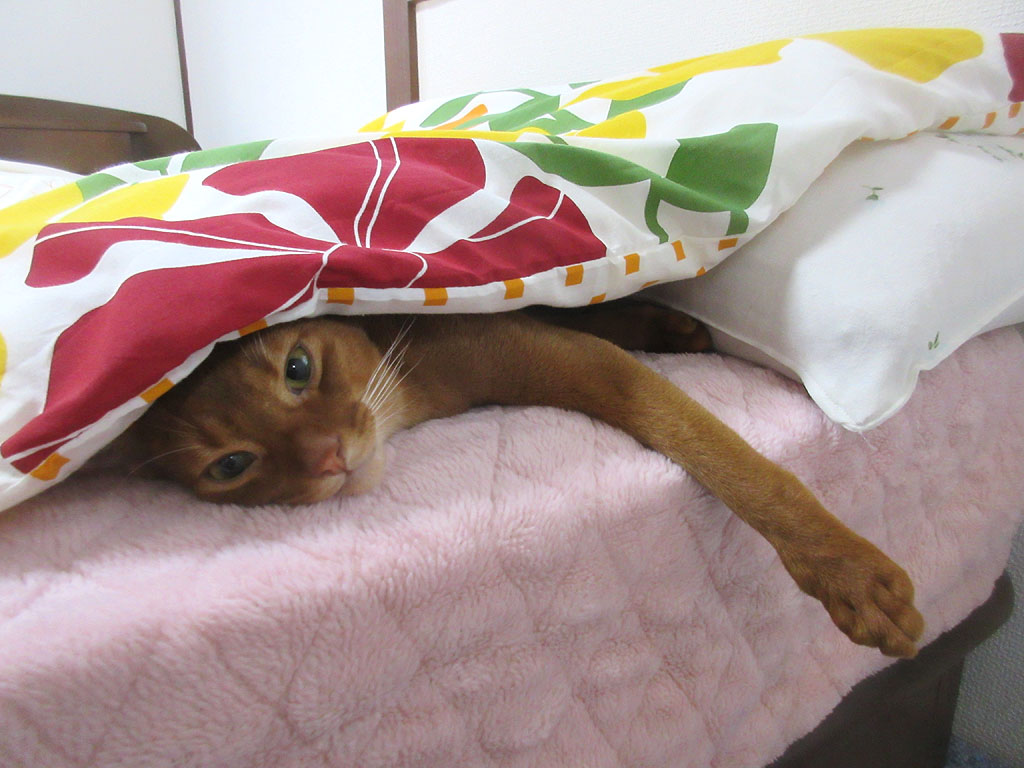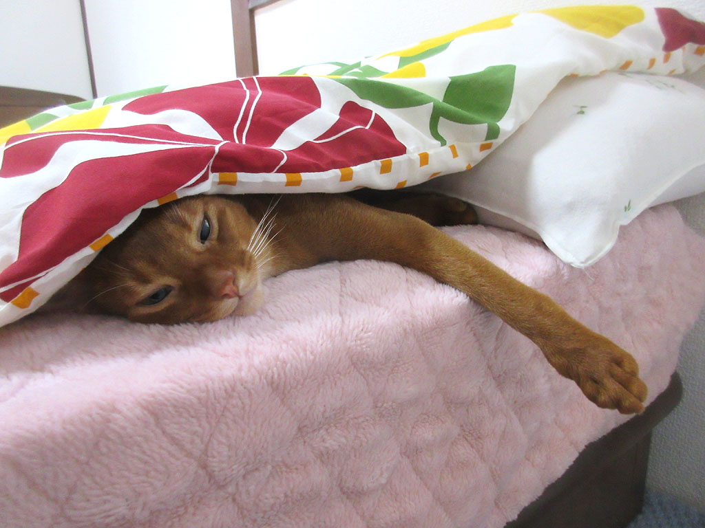 そしてその後、思っていた通りなのですが、1時間、トイレの中の、多分、トイレの砂の上で横になっていたアビのすけが、私のベットに潜り込んで来て、ゴーゴーと言いながら、私の右脇の所に陣取って、当たり前の様に私の右腕を枕にして寝てしまったのです…。