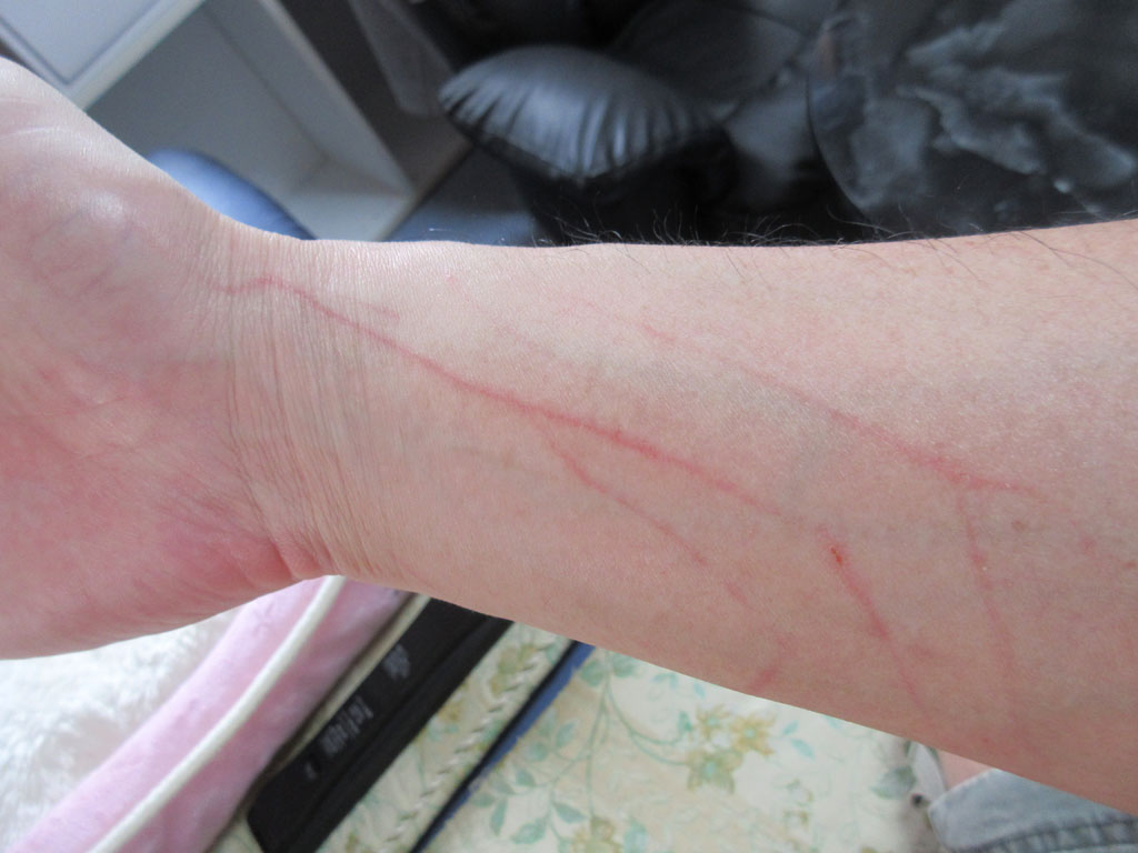 この程度の傷なんかは当たり前で、最近は薄着なので、私の胸やお腹の辺りにも、これよりもっと酷い引っ掻き傷があるのですが、仮に、私が未婚の若い女性だったら、こんな体ではお嫁に行けない位の体になっているので、若い女性の猫飼いさんは大変だと思う。