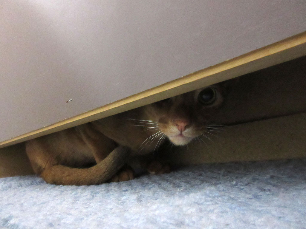 夜が更けて来ると始まる、アビのすけの奇行…、トイレで寝たり、こんな所で隠れる様に寝たり、なんでそんな変な行動をするのよ、アビのすけ…。