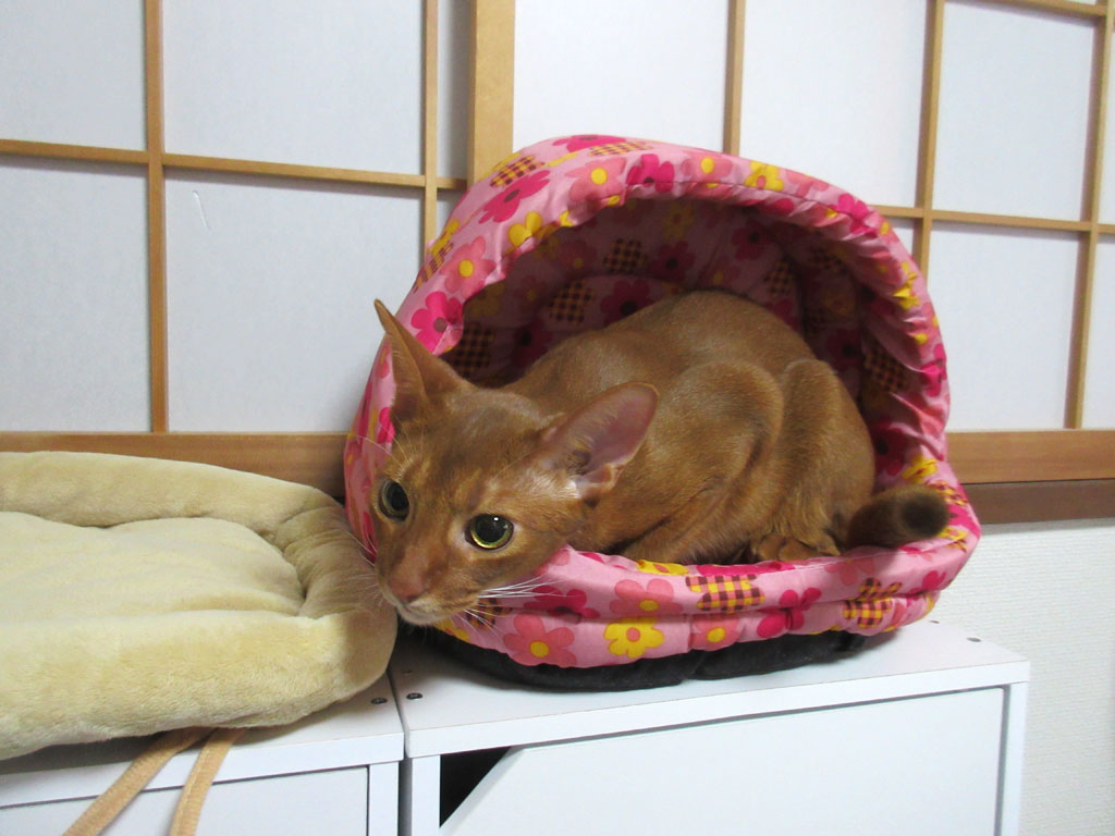 猫ベットに入ったアビシニアン。一応、猫ベットの中には入ってくれましたが…。