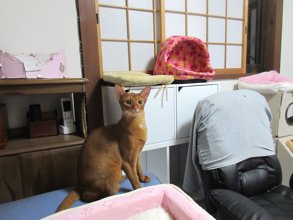 新しい猫ベットとアビシニアン。そしてこれは、昨日の晩の写真なのですが、新しい猫ベットとアビのすけの様子ですが、猫ベットを出したら、まずはやはり、アビのすけがやって来たのです。