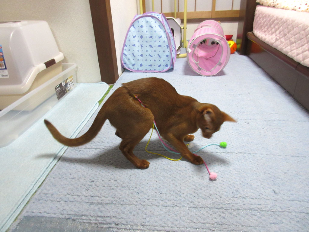 欲求不満になる可能性があると思い、レーザーポインターでアビのすけと遊ぶのを控えていて、最近は、ゴム紐を振り回してアビのすけと遊んであげているのですが、猫と遊ぶのもかなりの体力がいるので、この日は、アビのすけの腰にゴム紐を結んで、一人遊びをして貰ったのです。