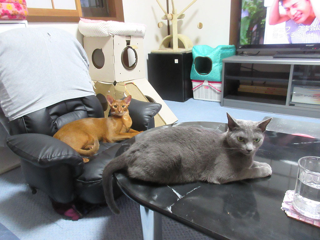 アビのすけ君とロシ子ちゃんが並ぶと、アビシニアンとロシアンブルーということもあるけれど、やっぱり男の子のアビのすけ君はガッシリ、女の子のロシ子ちゃんは丸くてふんわりという体つきだと思います。