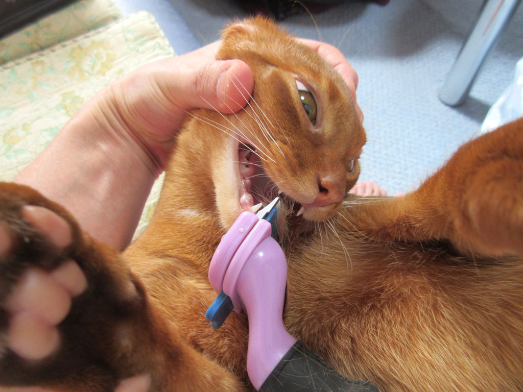 私はその都度、アビのすけにファーミネーターを噛ませない様に、こんな感じで頭をガッチリと押さえてやるのですが、ファーミネーターを噛もうとする時に、アビのすけは小悪魔みたいなものすごい形相になるので、その顔が面白くって、その写真を撮りたかったのですが、この時は残念ながら撮れなかったのです。