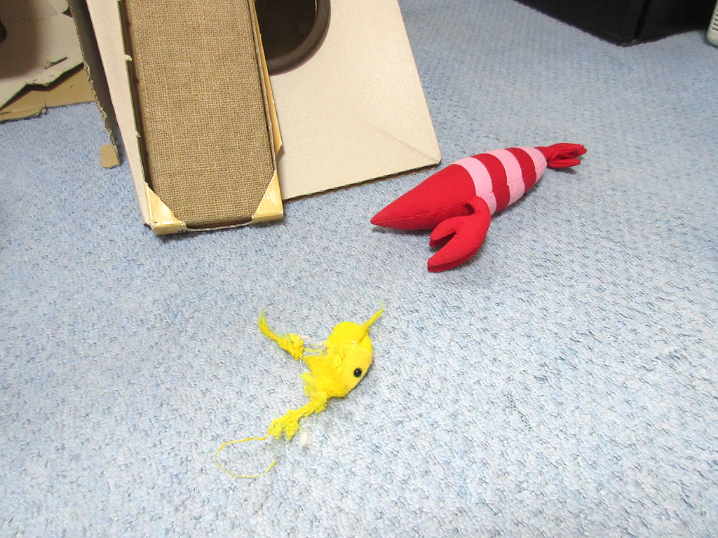 これは、ミニ冷蔵庫の上に置いている、ミニキャットタワーにぶら下がっていた、黄色の魚か何かの形をした小さなぬいぐるみの残骸…、中には綿が入っていたと思うのですが、中綿はとっくの昔に剥き出されていて見当たらず、無残な形にされてしまって、間違いなくアビのすけの仕業です。