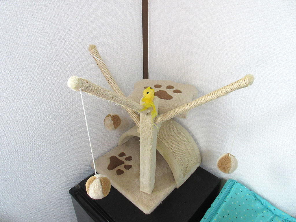 そうです、このキャットタワーの、丸くなっている、潜り込めるような所の中にぶら下がっていたのですが、とうとう、ちぎられてしまいました…。