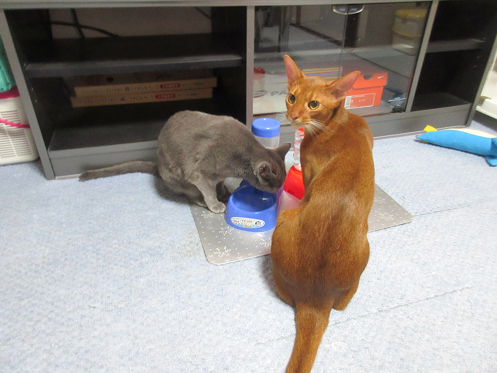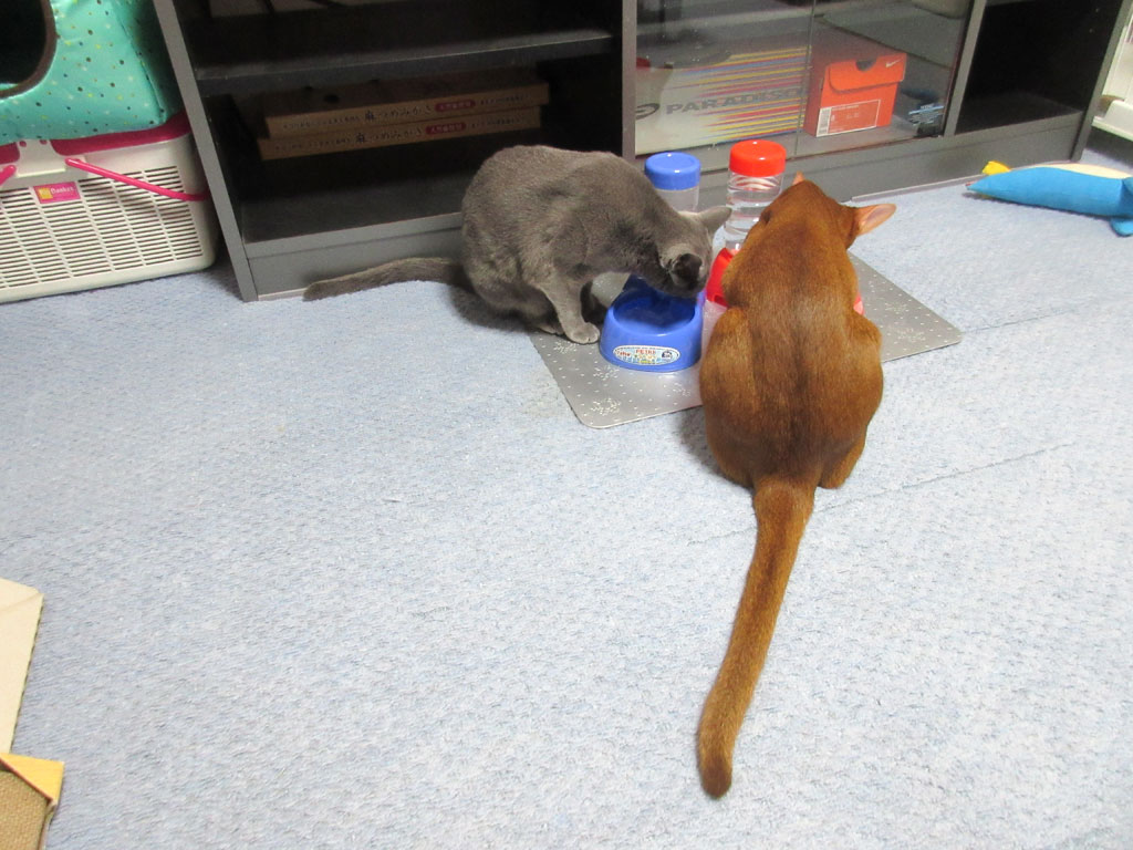 そして、ロシ子のオーラルケアのリーバⅢのスプレー中、下げていた水を戻してあげると、2にゃんが仲良く、水を飲み始めましたよ…、そうそう、腎臓病にならない為にも、たくさん水を飲んでちょうだいよー…!