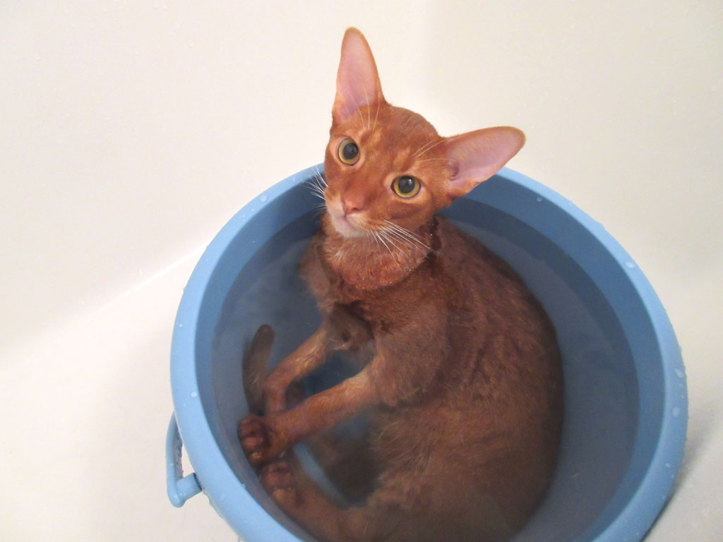私がアビのすけを押さえてる訳じゃないのに、アビのすけが勝手にバケツの湯船に浸かっているのに、鳴いてたアビのすけ…、なんで鳴いてるのよ、アビのすけ…?