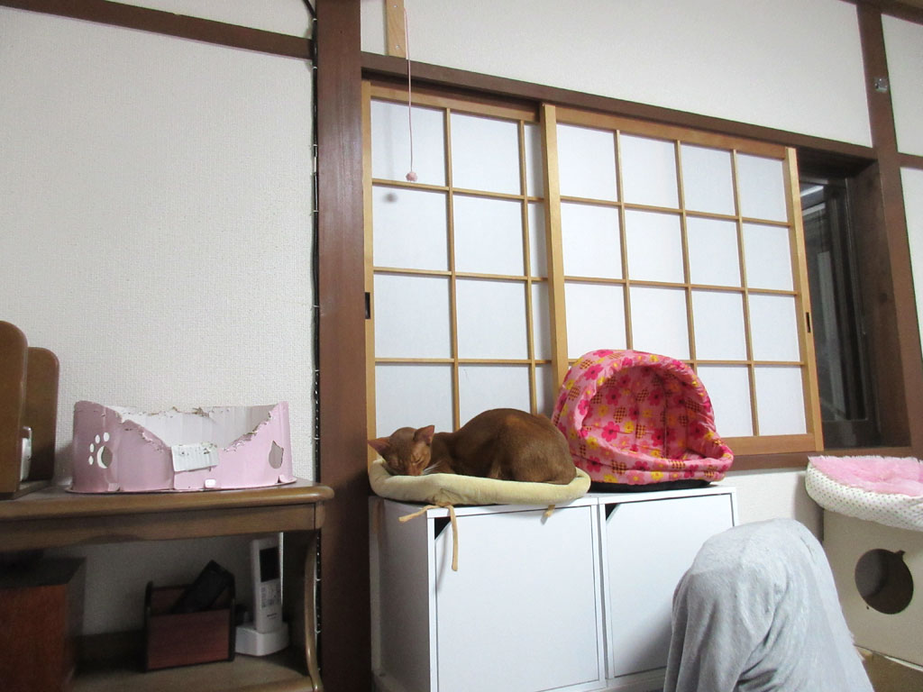 そしてこれはその翌日の朝、9/1(火)の早朝のアビのすけですが、朝方のこの定位置で、ぐっすり寝ていましたよ。