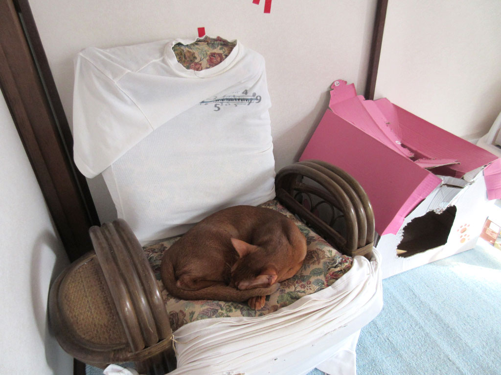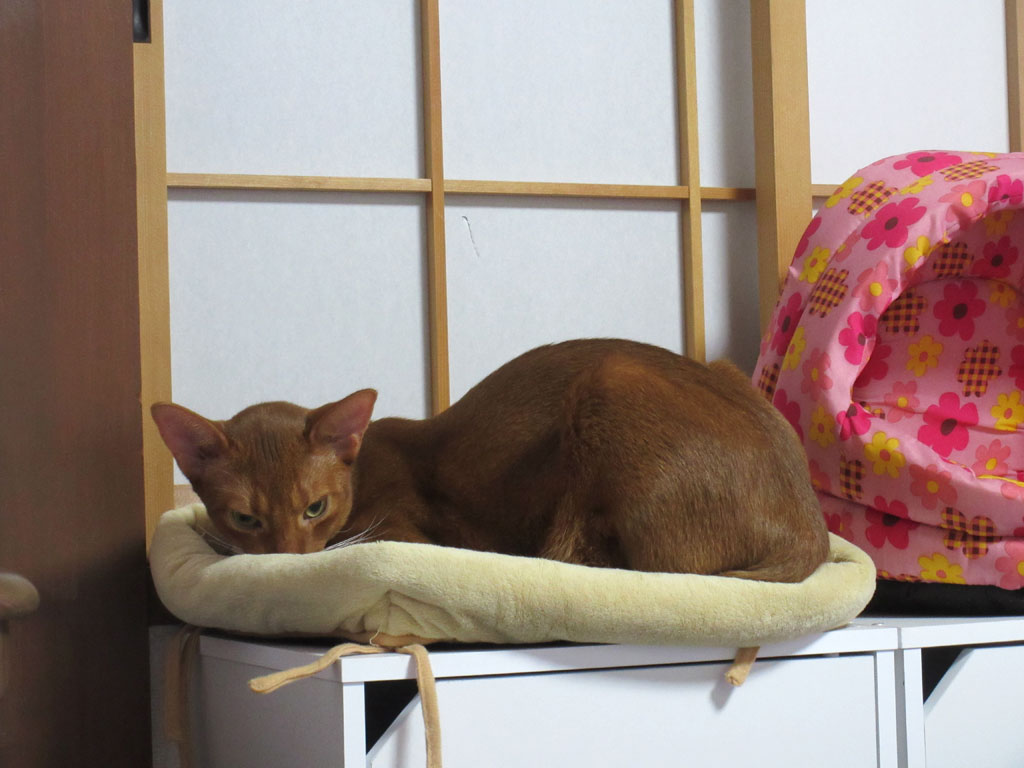 実際、私も、眠気眼の中、猫たちが来てくれるのは嬉しいので、眠いながらも、ご丁寧に猫たちの相手を毎回してあげているのですが、いざ、私が眠いのに頑張って起き出したら、アビのすけはここで気持ち良さそうに寝ているのです…、まぁー、勝手な奴なんです…。