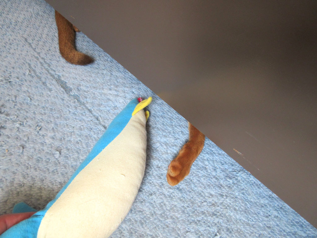 無理矢理、アビのすけを引っ張り出しても良いのですが、それも味気ないので、時間がある時は、こんな感じで、この蹴ぐるみでアビのすけをおびき寄せるのです…。