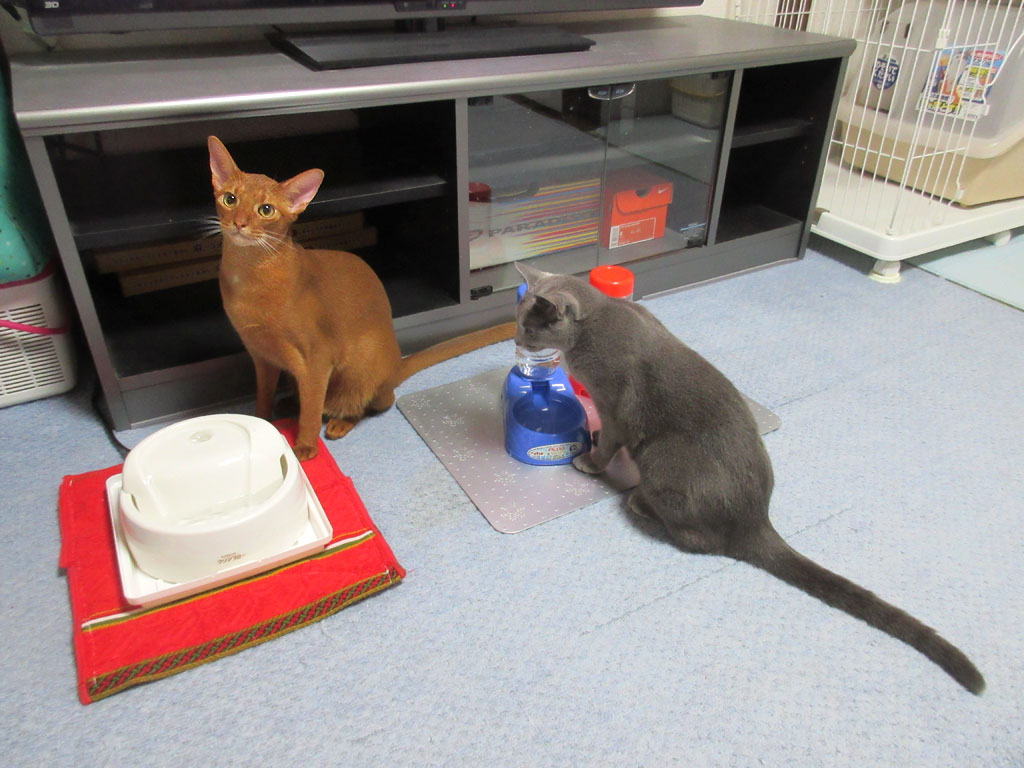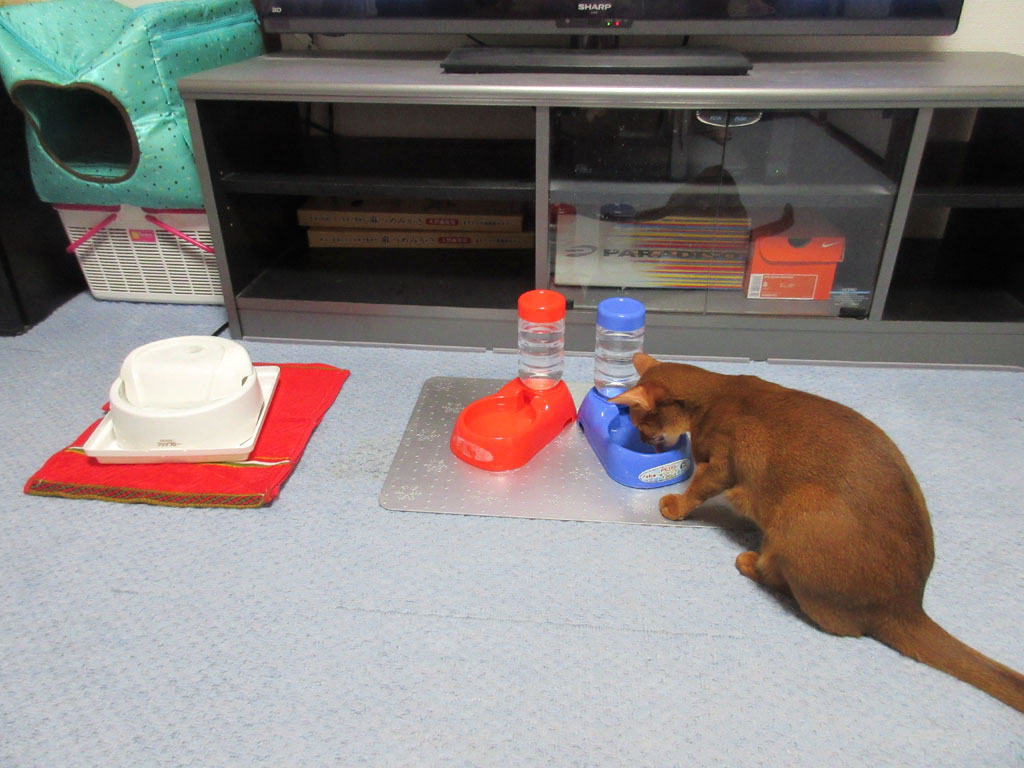 アビシニアンがみんな、そうではないと思いますが、我が家のアビのすけは、とにかく、ロシ子とは比較にならない位、本当によく水を飲むんですよ。