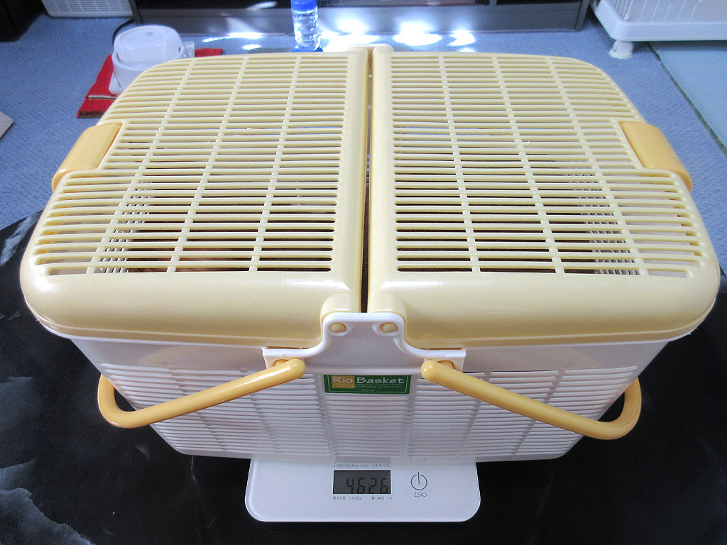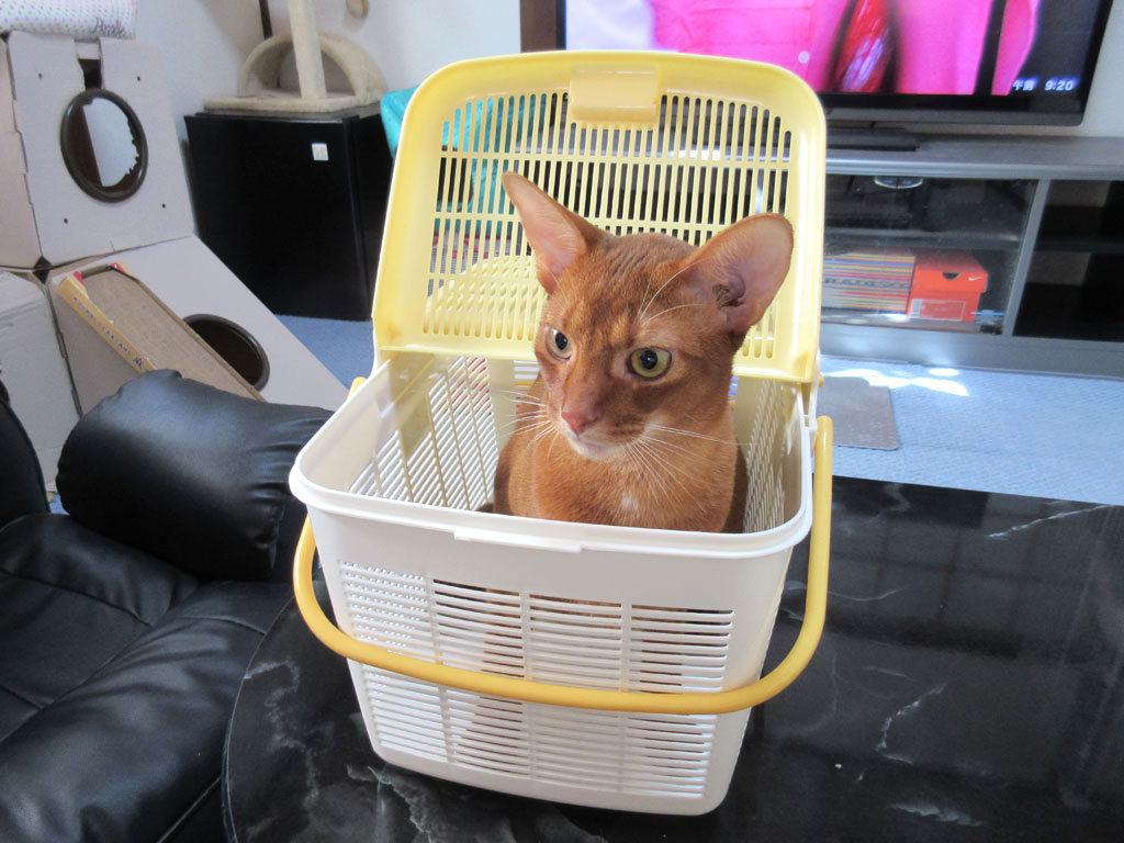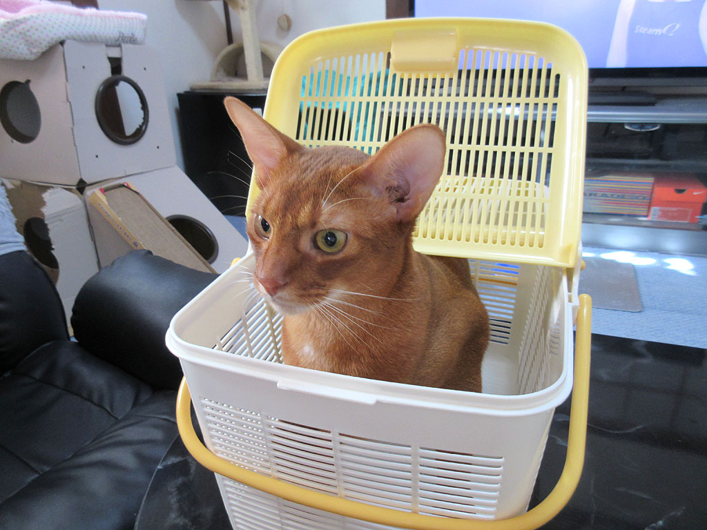 そして、体重測定が終わった後のアビのすけ…、猫たちのブラッシングも早くしたいし、1週間に1度の、室内全面コロコロ作業も早くしたいのだけど、こういう時に限って、アビのすけは籠から出てくれないのです…。