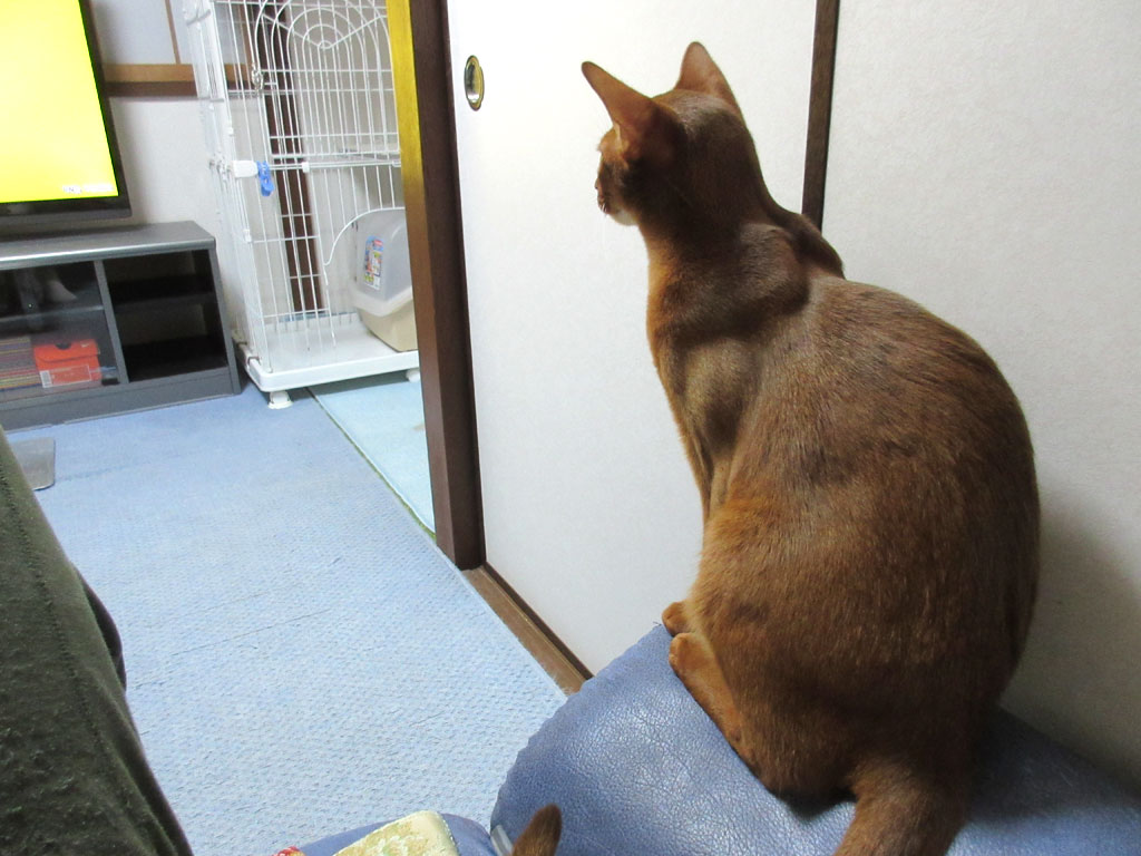 そして、私の膝を飛び出して、ソファーの縁に座ってテレビを見るアビのすけ…、面白い風景…。