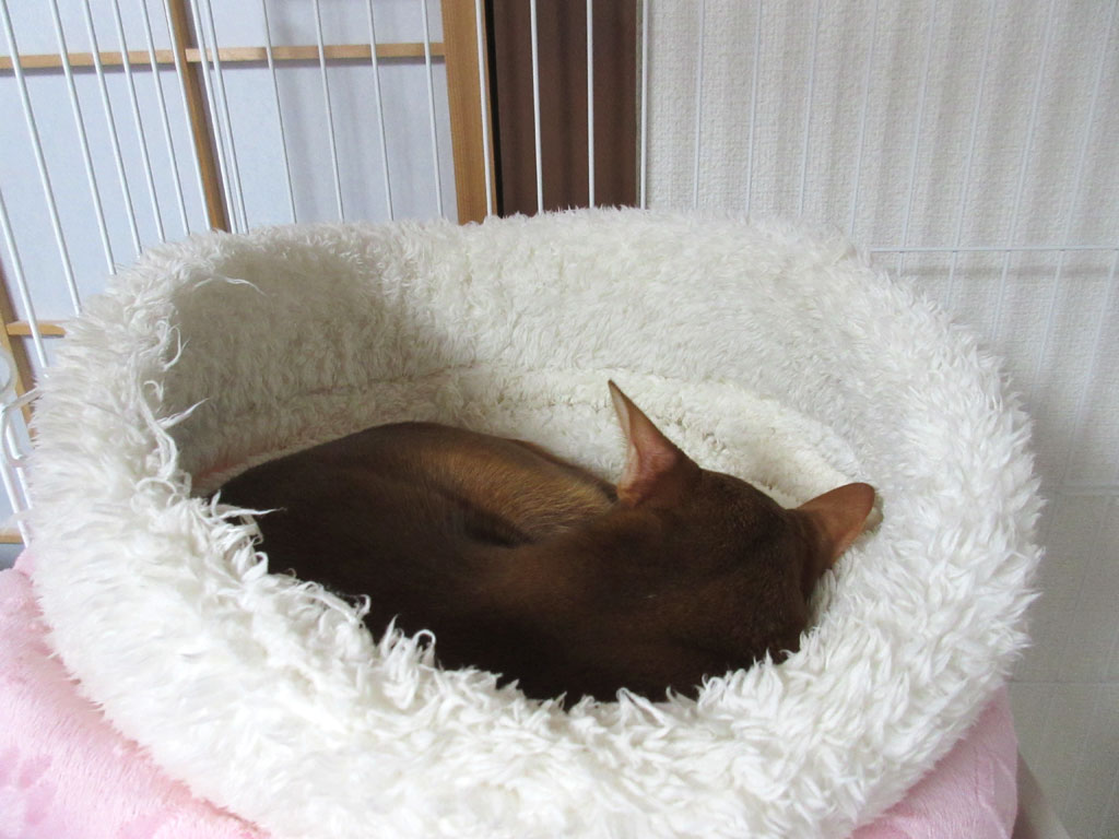 そして、一通り、満足するまで遊んだアビのすけは、最近のアビのすけのお眠の場、ケージの3階の猫ベットに行って、丸まって寝てしまいました。