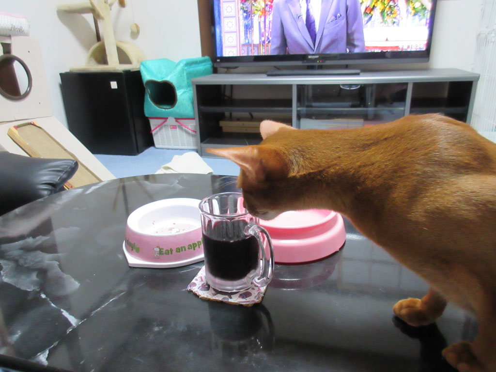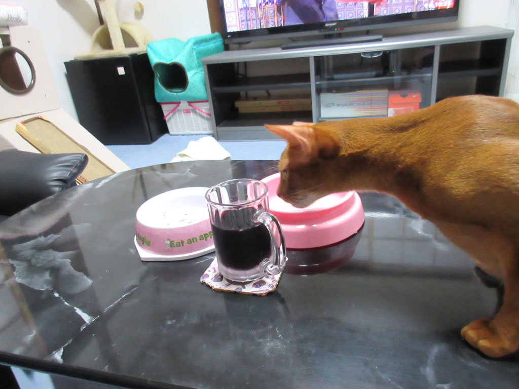 以前、1回だけ、ロシ子とアビのすけが追いかけっこをしていて、焼酎がなみなみと入っていたジョッキを、ロシ子がひっくり返してくれた事があったのですが、焼酎は透明なので、拭けば済みますが、ワインはこぼしたら色が沈着してしまうと思うので、絶対にこぼされてはいけないなぁー…。