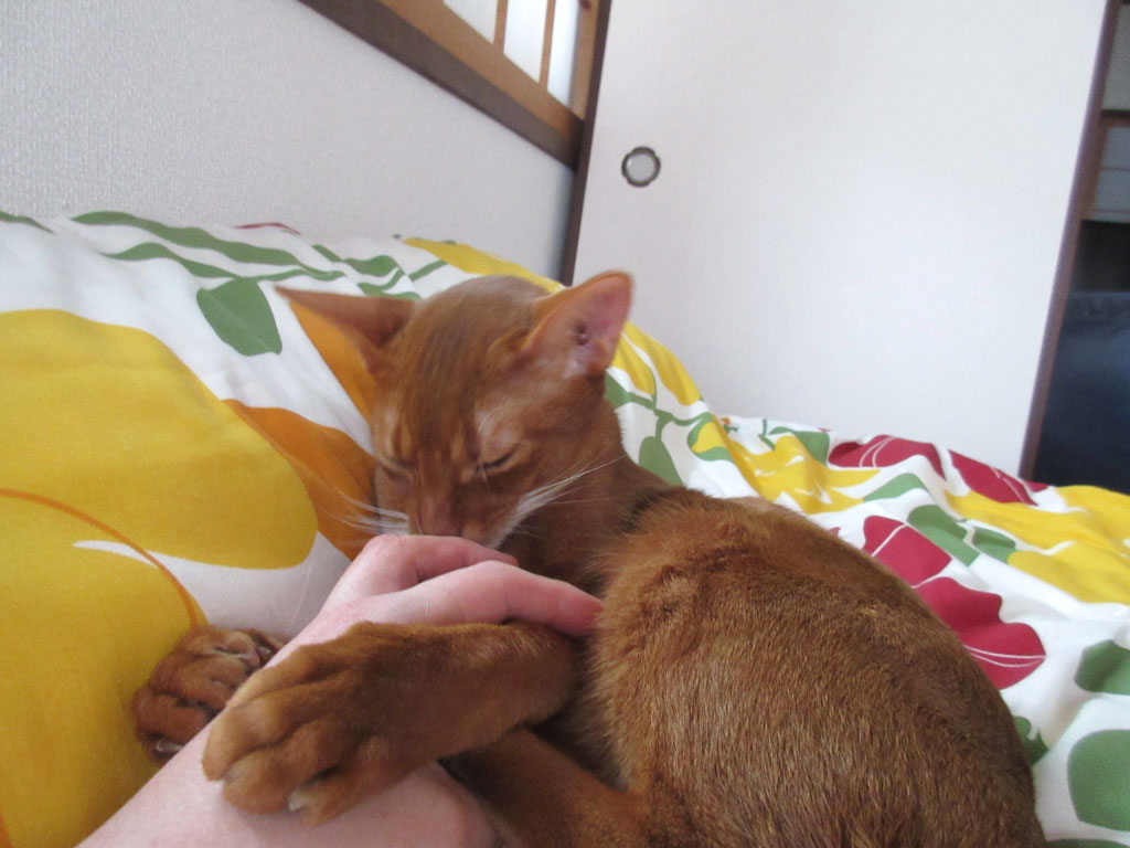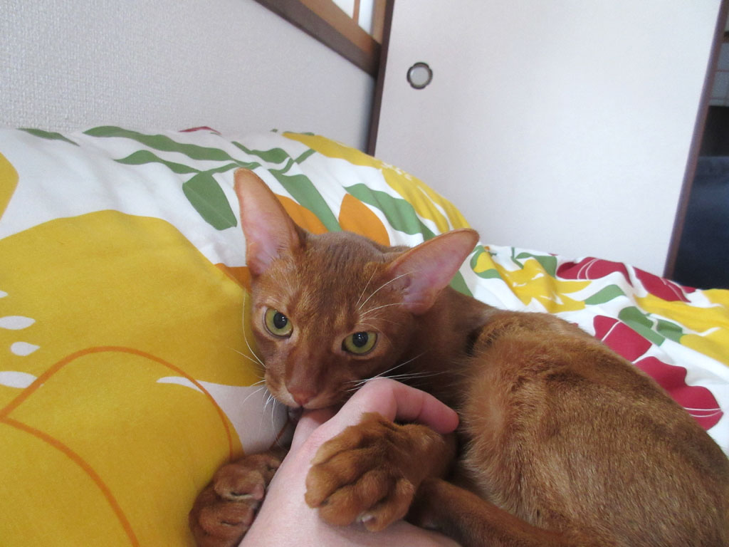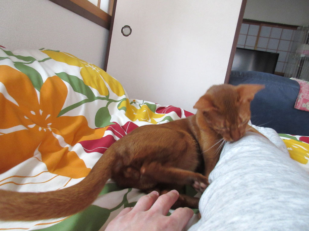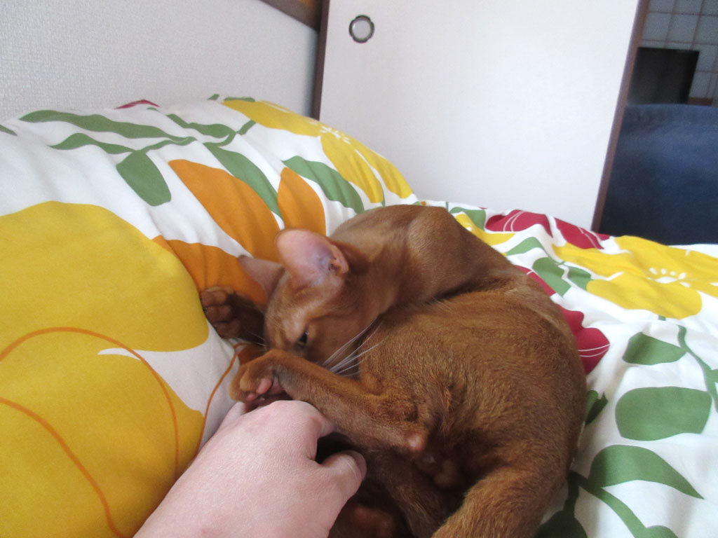 まずは、腕白なアビのすけの様子から…、これは、4日前のお昼間のアビのすけですが、アビのすけを抱っこして、ちょっとだけベットの上で休憩をしていた私だったのですが、アビのすけはもう、遊ぶ、遊ぶ…、私の手を捕まえて、私の手と一所懸命、遊んでいたのです。