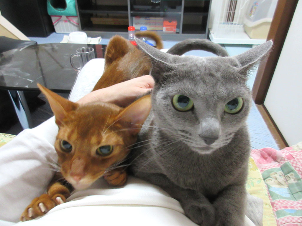 そしてこれは、その日の晩ご飯前の猫たちの写真…、晩ご飯前は、私がソファーに座ると、ロシ子が必ず、私の膝の上に飛び乗って来て、ご飯前の儀式、「ご飯欲しいかぁー!」「ニャー!」「ご飯欲しいかぁー!」「ニャー!」「ご飯欲しいかぁー!」「ニャー!」をしてからの鼻チューをして、晩ご飯を出してあげるのが恒例で、アビのすけはと言うと、ロシ子に気を使ってか、私の方にはやって来ず、部屋の中をぐるぐる周って、アビシニアン独特の、情けなくて弱々しい鳴き声で「ニャー!」って鳴くのが、いつもの我が家の風景なのですが、この日は初めて、ロシ子の牙城を崩して、アビのすけも私の膝の上に乗って来たのです。