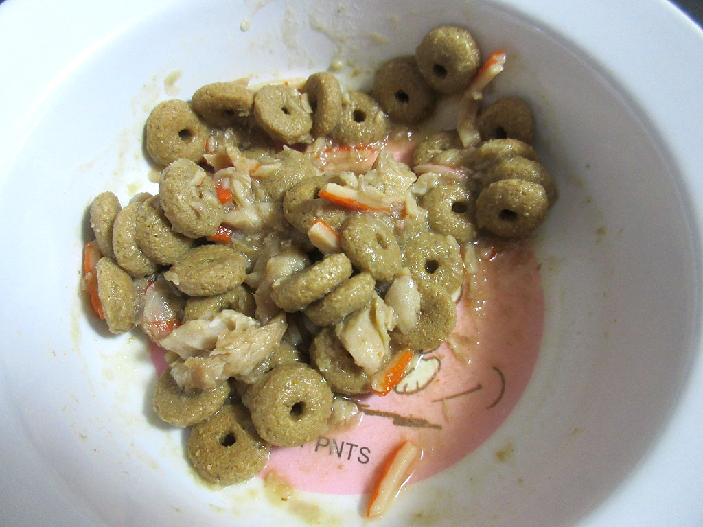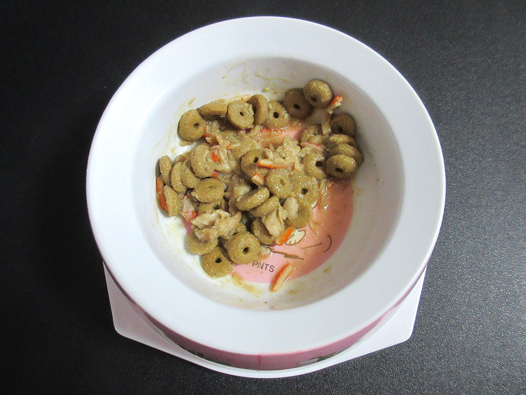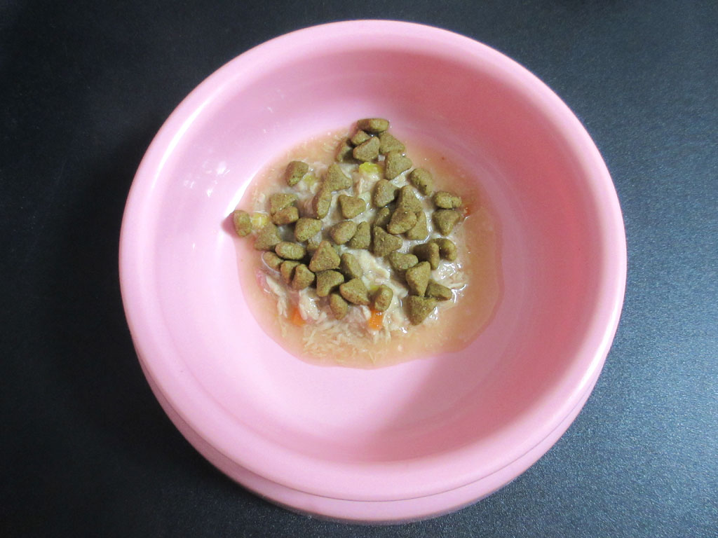 これ、前日の晩、ロシ子が食べず嫌いをして、食べなかったスペシャルご飯…、すっかり、カリカリがスープを吸ってしまって、全然、美味しそうに見えない…。