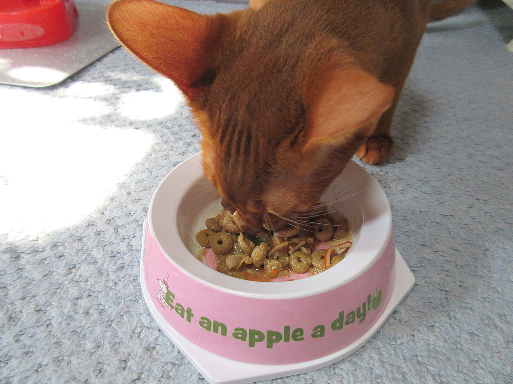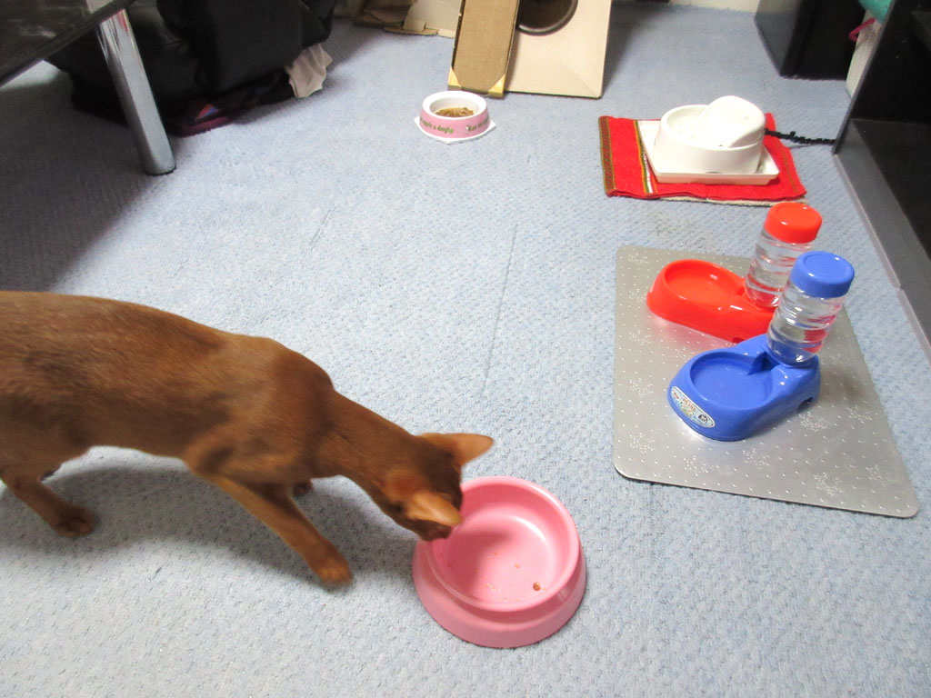 これは4日前の晩、この日はロシ子の記念日で、猫たちに美味しいご飯を出してあげたのですが、肝心のロシ子が食べず嫌いをしてくれた日の、アビのすけが特別晩ご飯を食べている様子です。