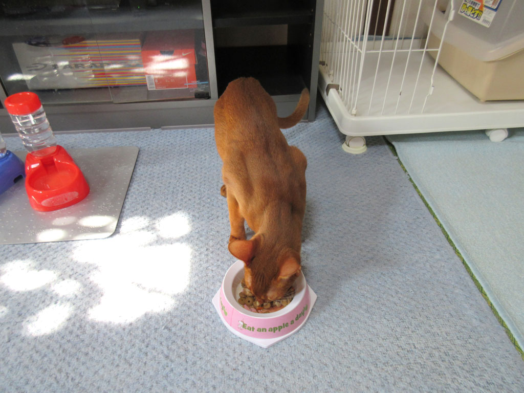 そしてこれは、その翌日、朝ご飯を食べるアビのすけの様子…、朝からモリモリ、朝ご飯にガッ付いていたアビのすけでした。