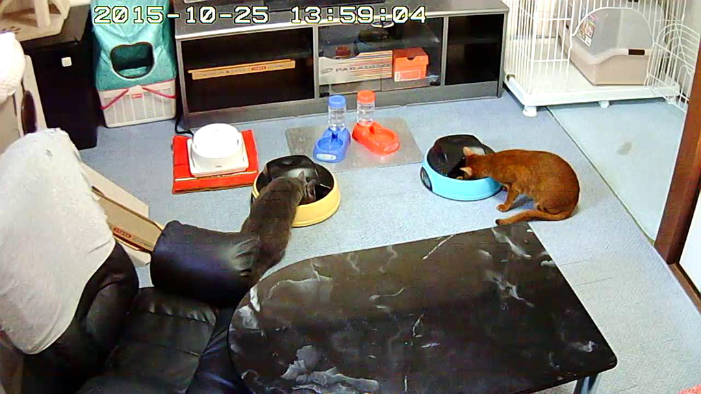 そしてこれは、その翌日、シャンプーをした後、自動給餌器でお昼ご飯を食べる我が家の猫たち…、この写真では分かりませんが、ロシ子もアビのすけもきれいになりましたが、でも、いつものゾイックではなく、マラセブでのシャンプーだった為、若干、パサパサな触り心地になってしまいました。