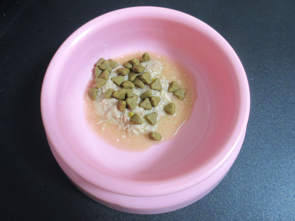 一応、缶詰の感じが分かりやすい様に、缶詰をほぐす前に写真を撮っていますが、この後、カリカリと缶詰を混ぜて、猫たちには出してあげています。