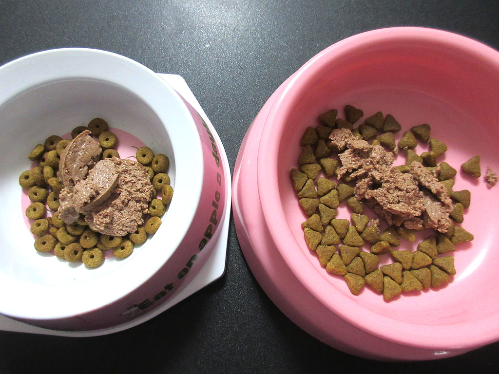 左側がロシ子のご飯、右側がアビのすけのご飯、カリカリは違いますが、缶詰は同じ物を食べています。