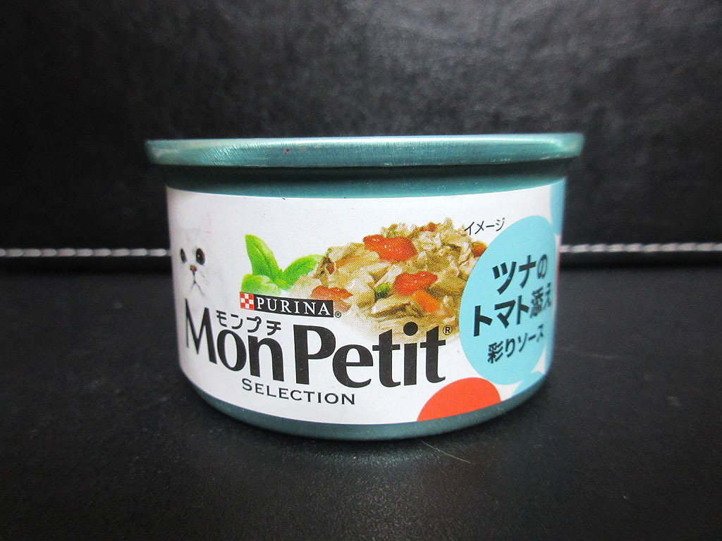 これは、我が家の猫たちが今週の(日)から食べてた、モンプチの大人用の缶詰「ツナのトマト添え 彩りソース」です。