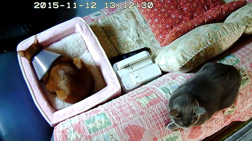 そして、良いアングルで写真を撮ろうと、少しずつ、少しずつ、Webカメラを動かしたのですが、やはりアビのすけ、気付いて起きてしまいました。