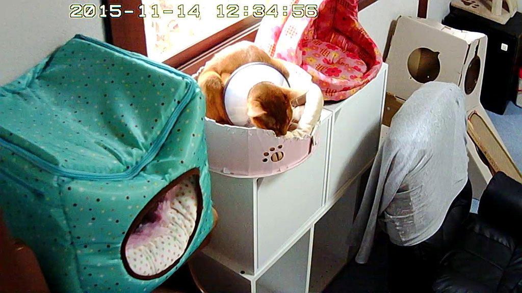 いつもは逆向きにはめているのですが、この普通の向きでエリザベスカラーをはめたら、慣れないせいか、アビのすけはそこら辺にぶつかりまくって歩いていたので、かわいそうになって、いつも通りの向きにはめ直してあげました。