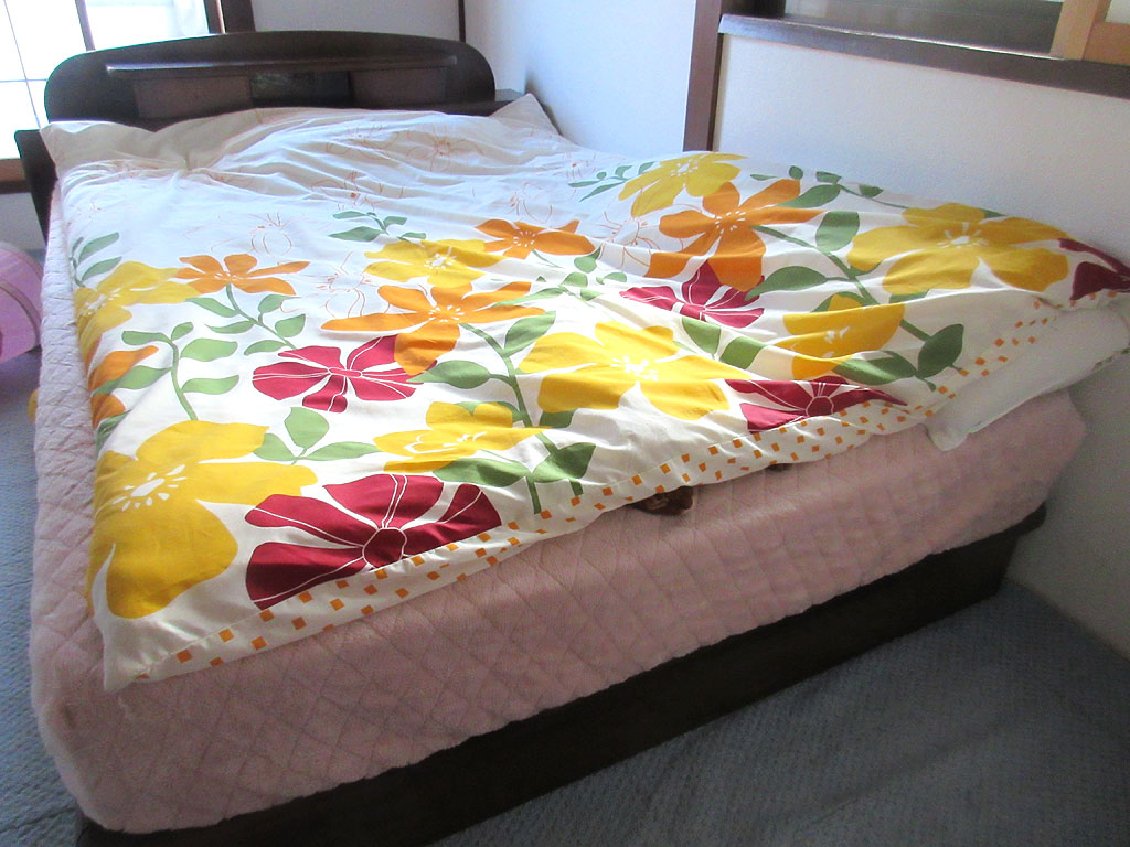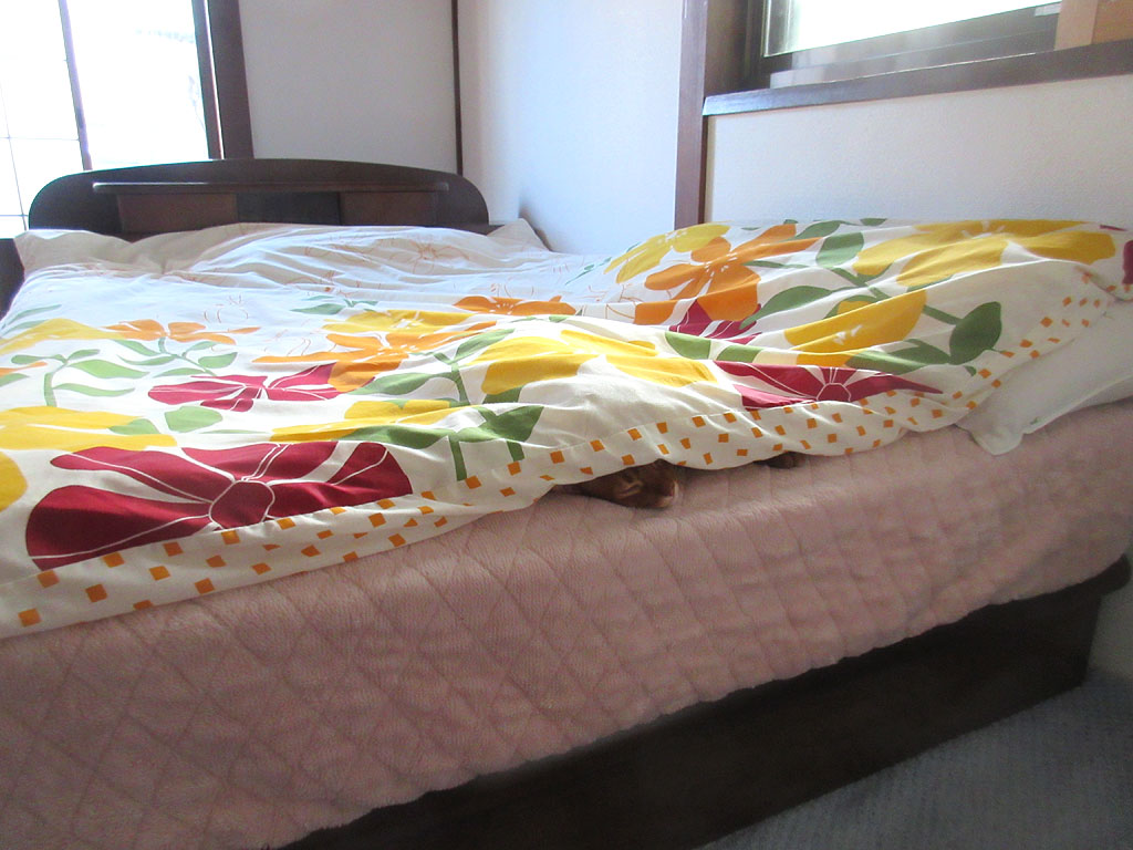 布団に潜って寝ているアビシニアン。そして、約2時間後、猫たちの朝のお世話をする為、2階に上がると、アビのすけは、顔だけ出していた状態から、すっぽり、布団を頭まで被って寝ていましたよ。