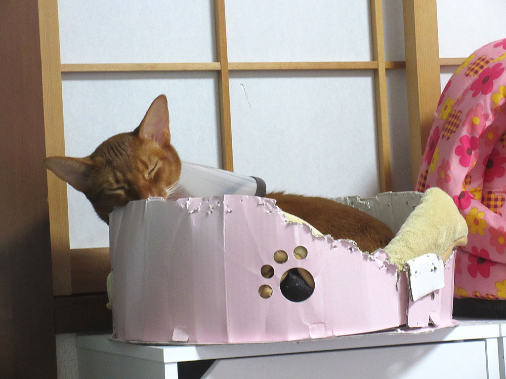 こんな感じで、限られた時間の中で猫たちのお世話をしているので、私はもっと、猫たちとコミュニケーションを取りたいのだけど、エリザベスカラーをはめられたアビのすけは、ピタッと動きが止まって寝てしまうので、私も、アビのすけの活発な姿を写真に撮る事が出来ないのです…。