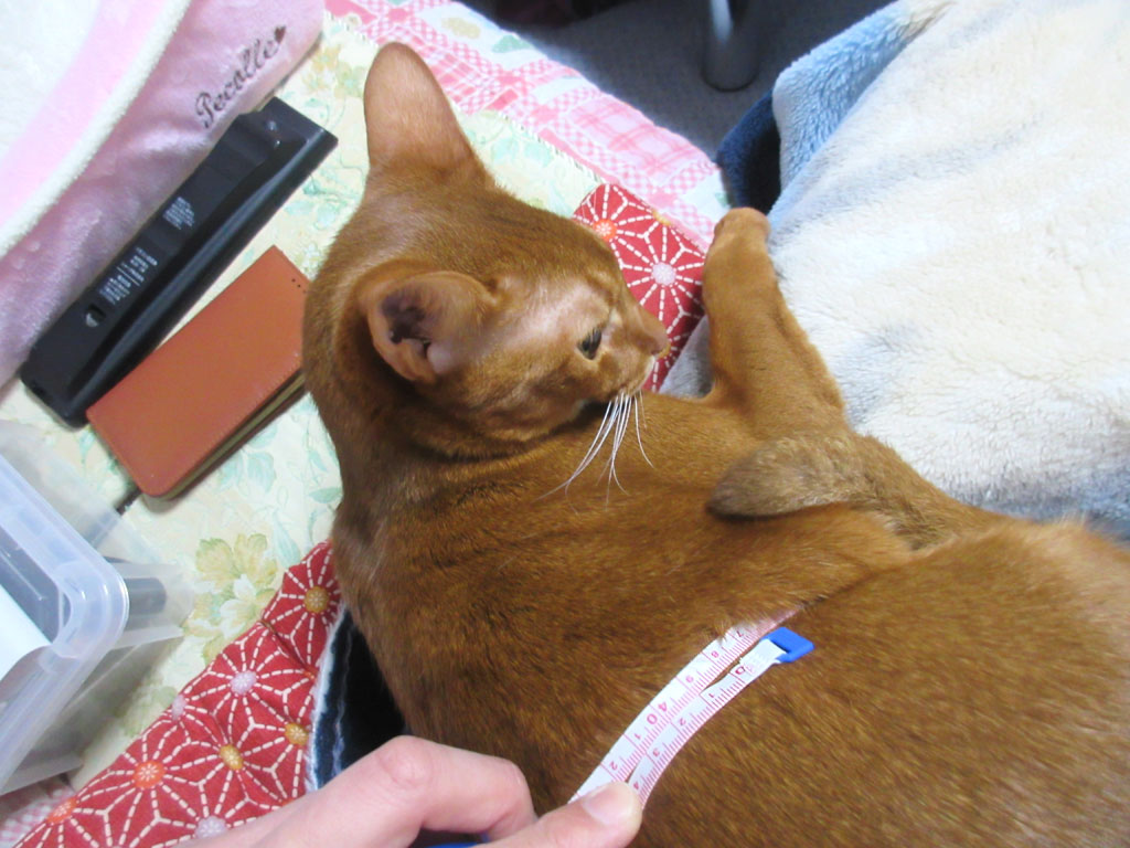 そして次は、アビのすけの膝から踵までの長さを測定…、こっちは、アビのすけの視界にメジャーが入らないので、普通におとなしく測らせてくれました。