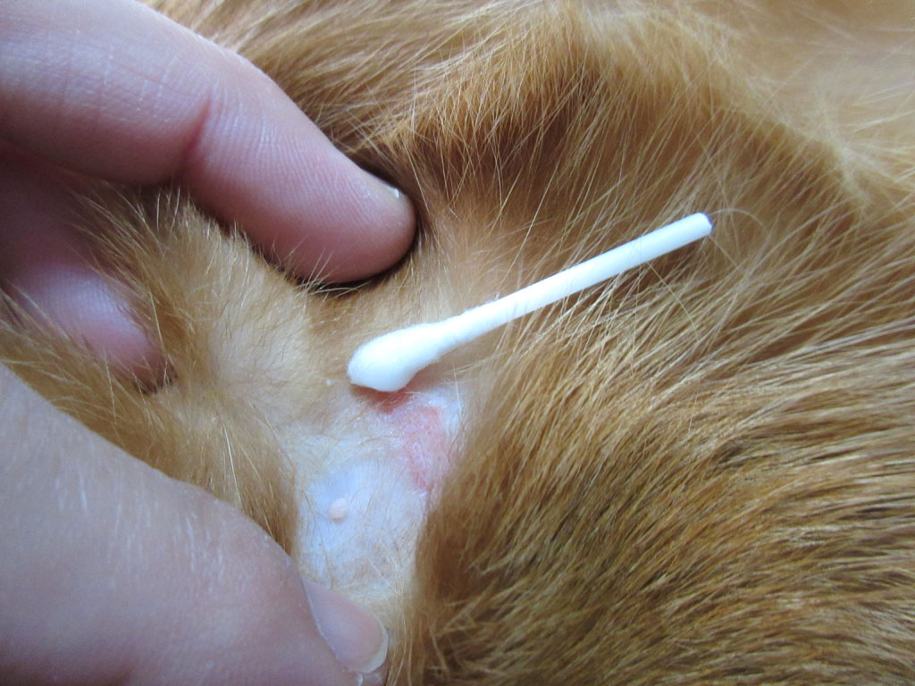 そして、このモメタオティックを綿棒に付けて、アビのすけのお腹の皮膚炎の部分に塗ります。